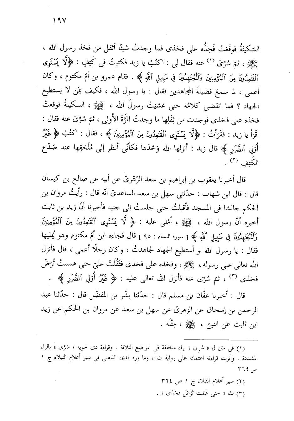 قال أخبرنا يعقوب بن إبراهيم بن سعد الزّهْرىّ عن أبيه عن صالح بن كيسان قال: قال ابن شهاب: حدّثنى سهل بن سعد الساعديّ أنّه قال: رأيتُ مروان بن الحكم جالسًا في المسجد فأقبلتُ حتى جلستُ إلى جنبه فأخبرنا أنّ زيد بن ثابت أخبره أنّ رسول الله، -صلى الله عليه وسلم-، أمْلى عليه: {لَا يَسْتَوِي الْقَاعِدُونَ مِنَ الْمُؤْمِنِينَ وَالْمُجَاهِدُونَ فِي سَبِيلِ اللَّهِ} [سورة النساء: ٩٥] قال فجاءه ابن أمّ مكتوم وهو يُمليها فقال: يا رسول الله لو أستطيع الجهاد لجاهدتُ، وكان رجلًا أعمى، قال فأنزل الله تعالى على رسوله، -صلى الله عليه وسلم-، وفخذه على فخذى فثَقُلَتْ علىّ حتى هممتُ تُرَضّ فخذى (¬٣)، ثمّ سُرِّى عنه فأنزل الله تعالى عليه: {غَيْرُ أُولِي الضَّرَرِ}.