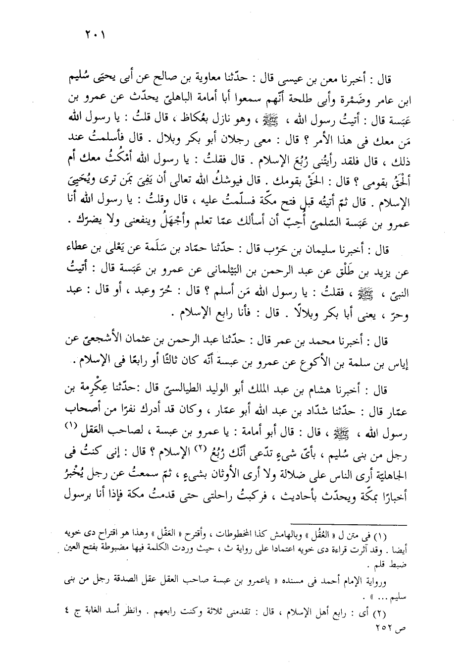قال: أخبرنا معن بن عيسى قال: حدّثنا معاوية بن صالح عن أبي يحيَى سُليم ابن عامر وضَمْرة وأبى طلحة أنّهم سمعوا أبا أمامة الباهلىّ يحدّث عن عمرو بن عَبَسة قال: أتيتُ رسول الله، -صلى الله عليه وسلم-، وهو نازل بعُكاظ، قال قلتُ: يا رسول الله مَن معك في هذا الأمر؟ قال: معى رجلان أبو بكر وبلال. قال فأسلمتُ عند ذلك، قال فلقد رأيتُنى رُبُعَ الإسلام. قال فقلتُ: يا رسول الله أمْكُثُ معك أم ألْحَقُ بقومى؟ قال: الحَقْ بقومك. قال فيوشكُ الله تعالى أن يَفِىَ بمَن ترى ويُحَيِىَ الإسلام. قال ثمّ أتيتُه قبل فتح مكّة فسلّمتُ عليه، قال وقلتُ: يا رسول الله أنا عمرو بن عَبَسة السّلمىّ أُحِبّ أن أسألك عمّا تعلم وأجْهَلُ وينفعنى ولا يضرّك.