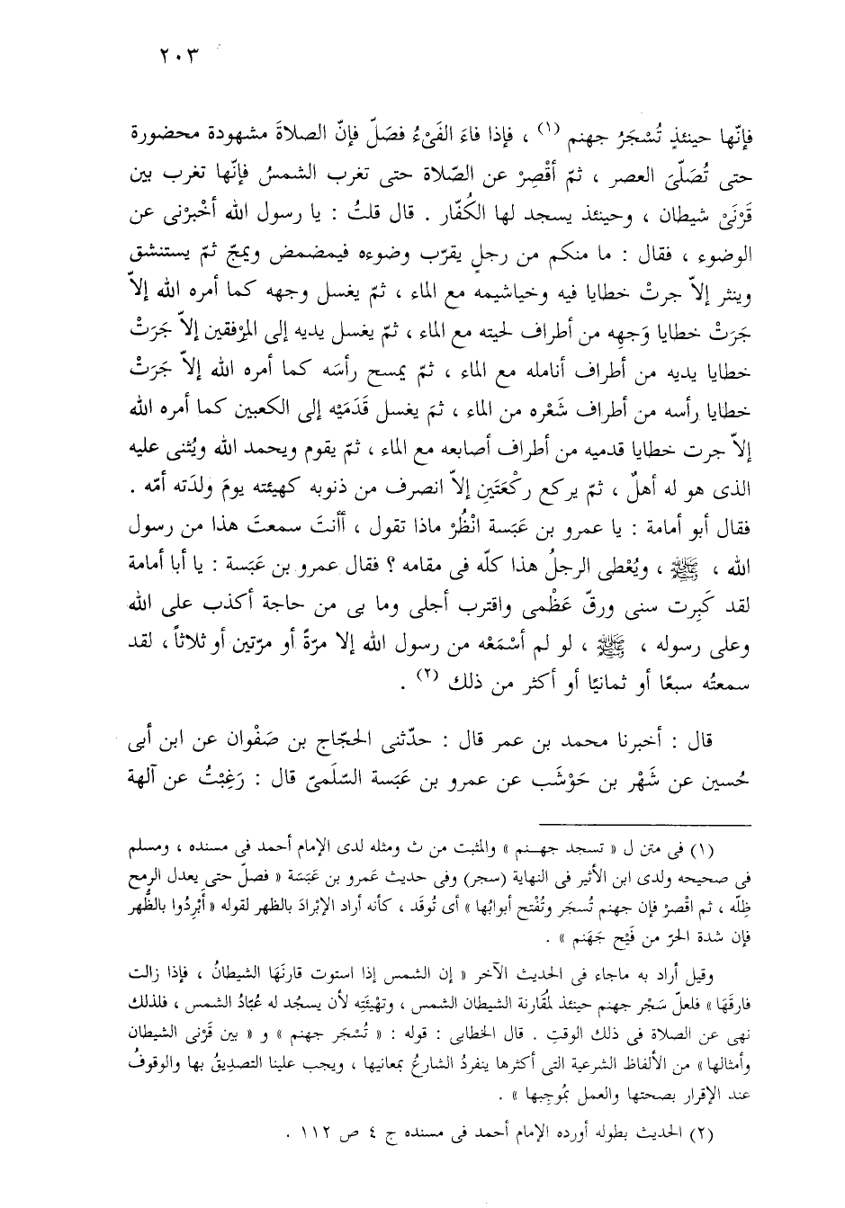 فإنّها حينئذٍ تُسْجَرُ جهنم (¬١)، فإذا فاءَ الفَىْءُ فصَلّ فإنّ الصلاةَ مشهودة محضورة حتى تُصَلّىَ العصر، ثمّ أقْصِرْ عن الصّلاة حتى تغرب الشمسُ فإنّها تغرب بين قَرْنَىْ شيطان، وحينئذ يسجد لها الكُفّار. قال قلتُ: يا رسول الله أخْبرْنى عن الوضوء، فقال: ما منكم من رجلٍ يقرّب وضوءه فيمضمض ويمجّ ثمّ يستنشق وينثر إلّا جرتْ خطايا فيه وخياشيمه مع الماء، ثمّ يغسل وجهه كما أمره الله إلّا جَرَتْ خطايا وَجهِه من أطراف لحيته مع الماء، ثمّ يغسل يديه إلى المِرْفقين إلّا جَرَتْ خطايا يديه من أطراف أنامله مع الماء، ثمَ يمسح رأسَه كما أمره الله إلّا جَرَتْ خطايا رأسه من أطراف شَعْره من الماء، ثمَ يغسل قَدَمَيْه إلى الكعبين كما أمره الله إلّا جرت خطايا قدميه من أطراف أصابعه مع الماء، ثمّ يقوم ويحمد الله ويُثنى عليه الذى هو له أهلٌ، ثمّ يركع ركْعَتَيِن إلّا انصرف من ذنوبه كهيئته يومَ ولدَته أمّه. فقال أبو أمامة: يا عمرو بن عَبَسة انْظُرْ ماذا تقول، أأنتَ سمعتَ هذا من رسول الله، -صلى الله عليه وسلم-، ويُعْطى الرجلُ هذا كلّه في مقامه؟ فقال عمرو بن عَبَسة: يا أبا أمامة لقد كَبِرت سنى ورقّ عَظْمى واقترب أجلى وما بى من حاجة أكذب على الله وعلى رسوله، -صلى الله عليه وسلم-، لو لم أسْمَعْه من رسول الله إلا مرّةً أو مرّتين أو ثلاثًا، لقد سمعتُه سبعًا أو ثمانيًا أو أكثر من ذلك (¬٢).