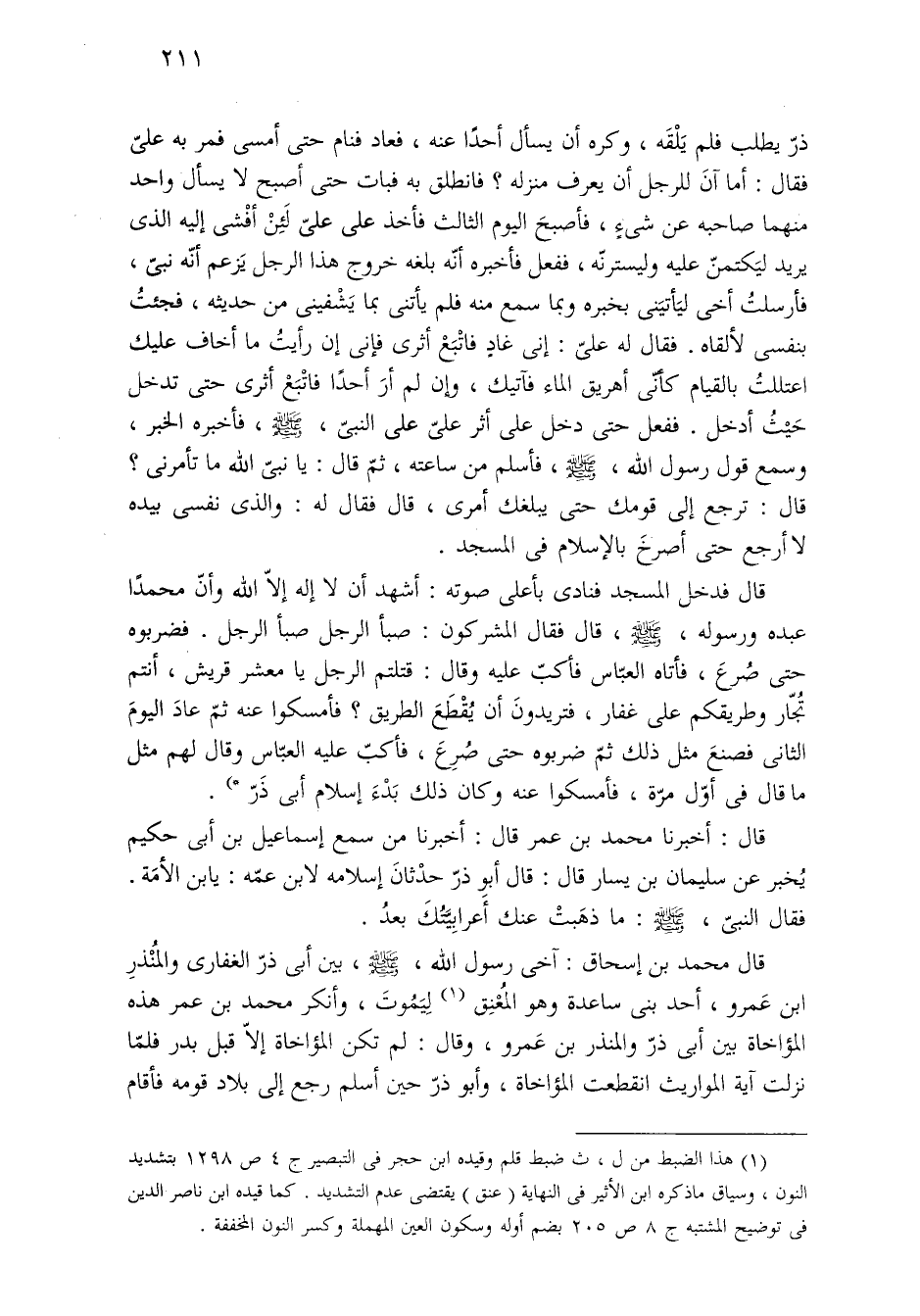 قال فدخل المسجد فنادى بأعلى صوته: أشهد أن لا إله إلّا الله وأنّ محمدًا عبده ورسوله، -صلى الله عليه وسلم-، قال فقال المشركون: صبأ الرجل صبأ الرجل. فضربوه حتى صُرعَ، فأتاه العبّاس فأكبّ عليه وقال: قتلتم الرجل يا معشر قريش، أنتم تُجّار وطريقكم على غفار، فتريدونَ أن يُقْطَعَ الطريق؟ فأمسكوا عنه ثمّ عادَ اليومَ الثانى فصنعَ مثل ذلك ثمّ ضربوه حتى صُرِعَ، فأكبّ عليه العبّاس وقال لهم مثل ما قال في أوّل مرّة، فأمسكوا عنه وكان ذلك بَدْءَ إسلام أبي ذَرّ] (*).