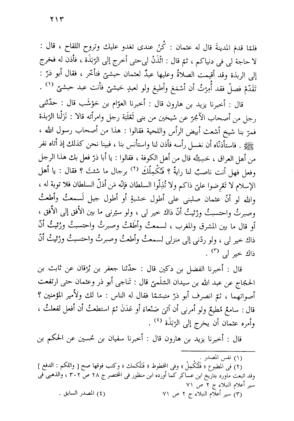 قال: أخبرنا الفضل بن دكين قال: حدّثنا جعفر بن بُرْقان عن ثابت بن الحجّاج عن عبد الله بن سيدان السّلَمىّ قال: تَناجى أبو ذر وعثمان حتى ارتفعت أصواتهما، ثمّ انصرف أبو ذرّ متبسّمًا فقال له الناس: ما لك ولأمير المؤمنين؟ قال: سامعٌ مُطيعٌ ولو أمرنى أن آتىَ صَنْعاءَ أو عَدَنَ ثمّ استطعتُ أن أفعل لفعلتُ، وأمره عثمان أن يخرج إلى الرّبَذَة (¬٤).