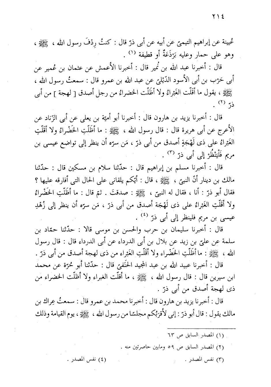 قال: أخبرنا مسلم بن إبراهيم قال: حدّثنا سلام بن مسكين قال: حدّثنا مالك بن دينار أنّ النبيّ، -صلى الله عليه وسلم-، قال: أيّكم يلقانى على الحال التى أفارقه عليها؟ فقال أبو ذرّ: أنا، فقال له النبيّ، -صلى الله عليه وسلم-: صدقتَ. ثمّ قال: ما أظَلّتِ الخَضْراءُ ولا أقَلّتِ الغَبْراءُ على ذى لَهْجَة أصدق من أبي ذرّ، مَن سرّه أن ينظر إلى زُهْدِ عيسى بن مريم فلينظر إلى أبي ذرّ (¬٤).