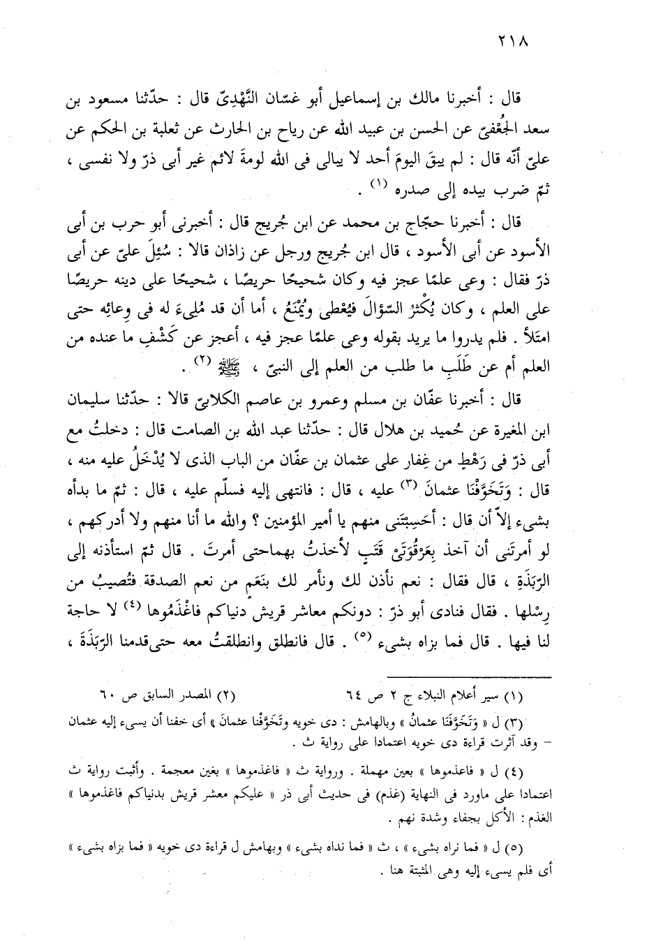 قال: أخبرنا عفّان بن مسلم وعمرو بن عاصم الكلابيّ قالا: حدّثنا سليمان ابن المغيرة عن حُميد بن هلال قال: حدّثنا عبد الله بن الصامت قال: دخلتُ مع أبي ذرّ في رَهْطٍ من غِفار على عثمان بن عفّان من الباب الذى لا يُدْخَلُ عليه منه، قال: وَتَخَوَّفْنَا عثمانَ (¬٣) عليه، قال: فانتهى إليه فسلّم عليه، قال: ثمّ ما بدأه بشئ إلّا أن قال: أحَسِبْتَنى منهم يا أمير المؤمنين؟ والله ما أنا منهم ولا أدركهم، لو أمرتَنى أن آخذ بِعَرْقُوَتَىْ قَتَبٍ لأخذتُ بهما حتى أمرتَ. قال ثمّ استأذنه إلى الرّبَذَةِ، قال فقال: نعم نأذن لك ونأمر لك بنَعَمٍ من نعم الصدقة فتُصيبُ من رِسْلها. فقال فنادى أبو ذرّ: دونكم معاشر قريش دنياكم فاغْذَمُوها (¬٤) لا حاجة لنا فيها. قال فما بزاه بشئ (¬٥). قال فانطلق وانطلقتُ معه حتى قدمنا الرّبَذَةَ،