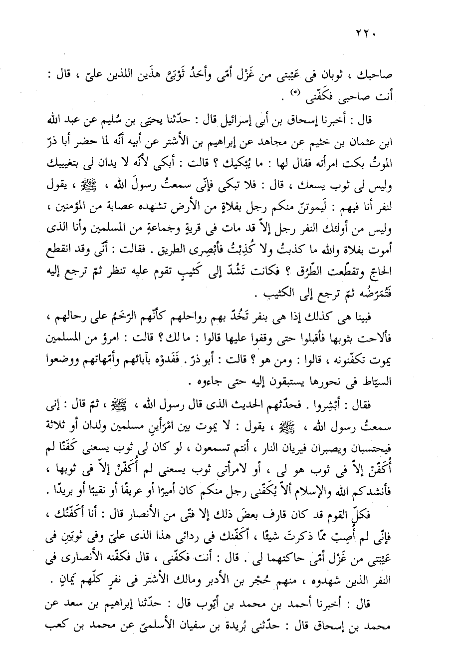 فقال: أبْشِروا. فحدّثهم الحديث الذى قال رسول الله، -صلى الله عليه وسلم-، ثمّ قال: إنى سمعتُ رسول الله، -صلى الله عليه وسلم-، يقول: لا يموت بين امْرَأينِ مسلمين ولدان أو ثلاثة فيحتسبان ويصبران فيريان النار، أنتم تسمعون، لو كان لى ثوب يسعنى كَفَنًا لم أُكَفّنْ إلّا في ثوب هو لى، أو لامرأتى ثوب يسعنى لم أُكَفّنْ إلّا في ثوبها، فأنشدكم الله والإسلام ألّا يُكَفّنى رجل منكم كان أميرًا أو عريفًا أو نقيبًا أو بريدًا.