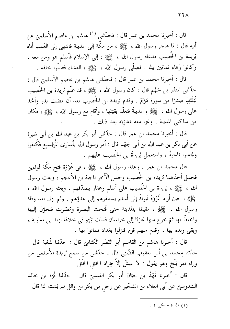 قال: أخبرنا هاشم بن القاسم أبو النّضْر الكنانيّ قال: حدّثنا شُعْبة قال: حدّثنا محمد بن أبي يعقوب الضّبّى قال: حدّثنى من سمع بُريدة الأسلمى من وراء نهر بَلْخ وهو يقول: لا عيشَ إلّا طِراد الخيْلِ الخَيْلَ.