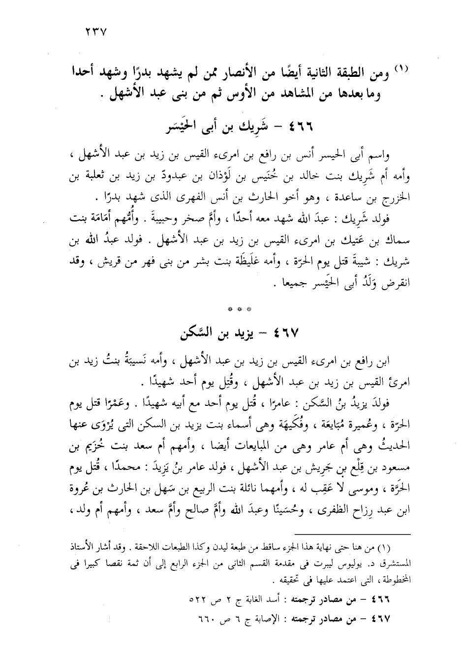 (¬١) من هنا حتى نهاية هذا الجزء ساقط من طبعة ليدن وكذا الطبعات اللاحقة. وقد أشار الأستاذ المستشرق د. يوليوس ليبرت في مقدمة القسم الثاني من الجزء الرابع إلى أن ثمة نقصا كبيرا في المخطوطة، التى اعتمد عليها في تحقيقه.