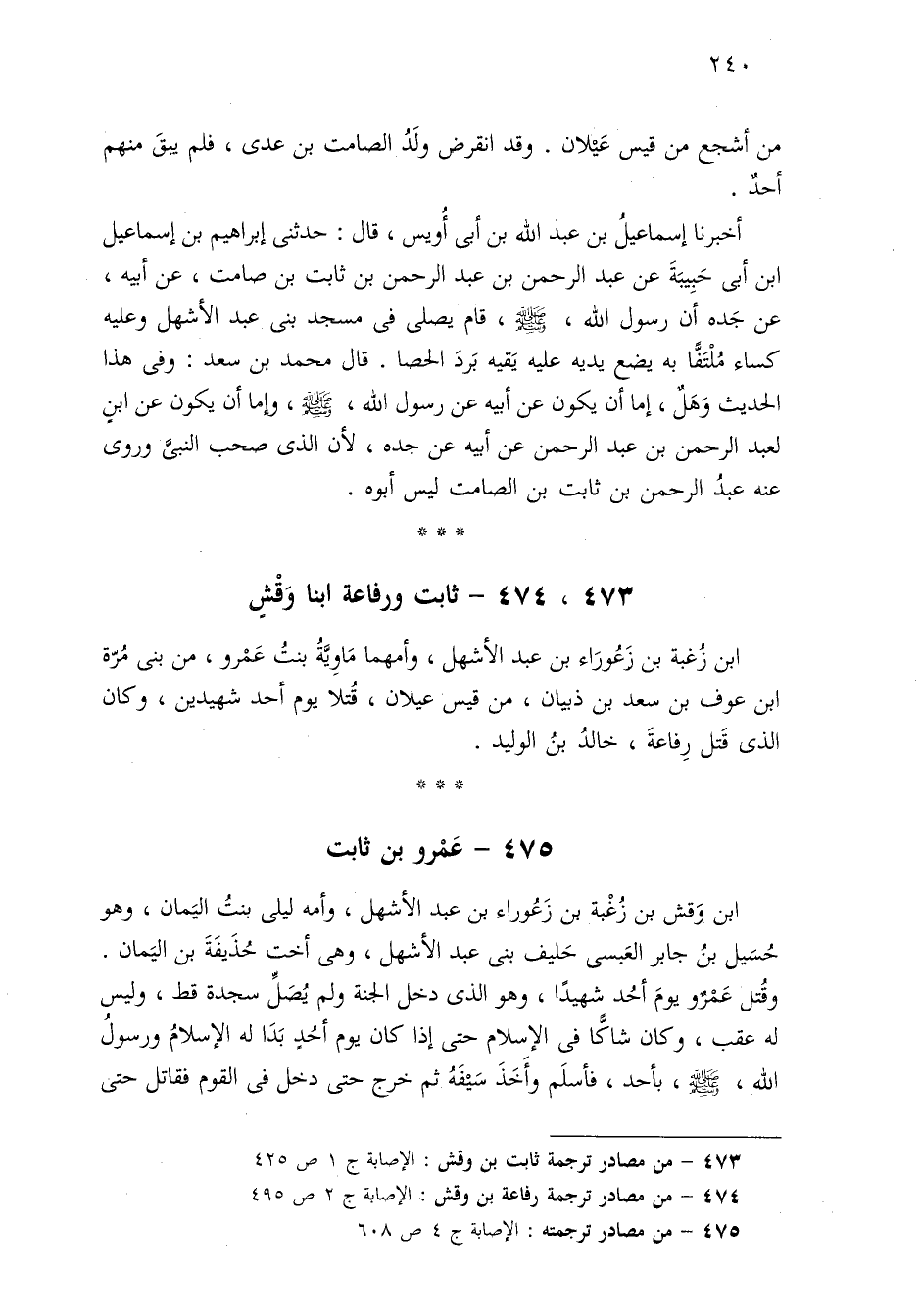 ٤٧٣ - من مصادر ترجمة ثابت بن وقش: الإصابة ج ١ ص ٤٢٥.
