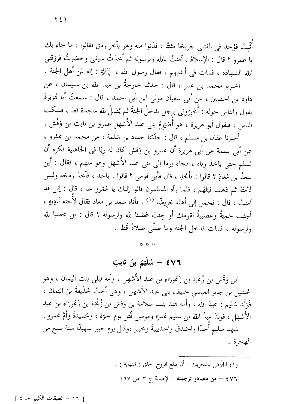 أخبرنا عفان بن مسلم، قال: حدّثنا حماد بن سَلمة، عن محمد بن عَمْرو، عن أبي سلمة عن أبي هريرة أن عمرو بن وَقش كان له رِبًا في الجاهلية فكره أن يُسلم حتى يأخذ رِباه، فجاء يوما إلى بنى عبد الأشهل وهو منهم، فقال: أين سعدُ بن مُعَاذٍ؟ قالوا: بأحُدٍ، قال فأين قومى؟ قالوا: بأحد، فأخذ رمحَه ولبس لامتَهُ ثم ذهب قِبَلَهُم، فلما رآه المسلمون قالوا إليك يا عَمْرو عنا، قال: إنى قد آمنتُ، قال: فحمل إلى أهله جَرِيضًا (¬١)، فأتاه سعد بن معاذ فقال لأُخته نَادِيهِ، أجِئتَ حَمِيّةً وعصبيةً لقومك أو جِئتَ غضبًا لله ولرسوله؟ قال: بل غضبا لله ولرسوله، فمات فدخل الجنة وما صلّى صلاةً قَط.