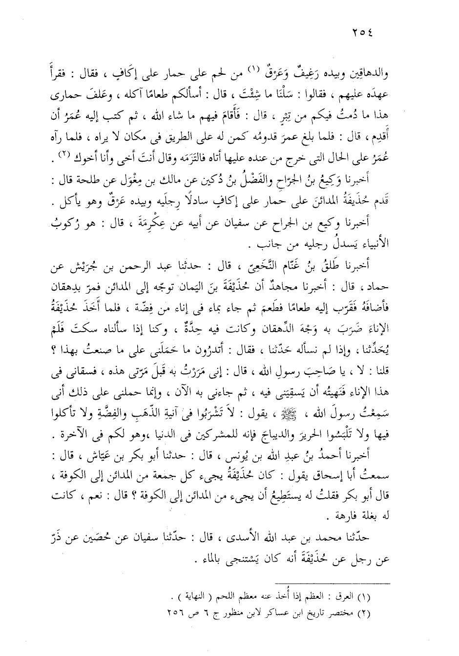 أخبرنا وَكِيعُ بنُ الجرّاحِ والفَضْلُ بنُ دُكين عن مالك بن مِغْوَل عن طلحة قال: قَدم حُذَيفَةُ المدائنَ على حمار على إكافٍ سادلًا رِجلَيه وبيده عَرْقٌ وهو يأكل.