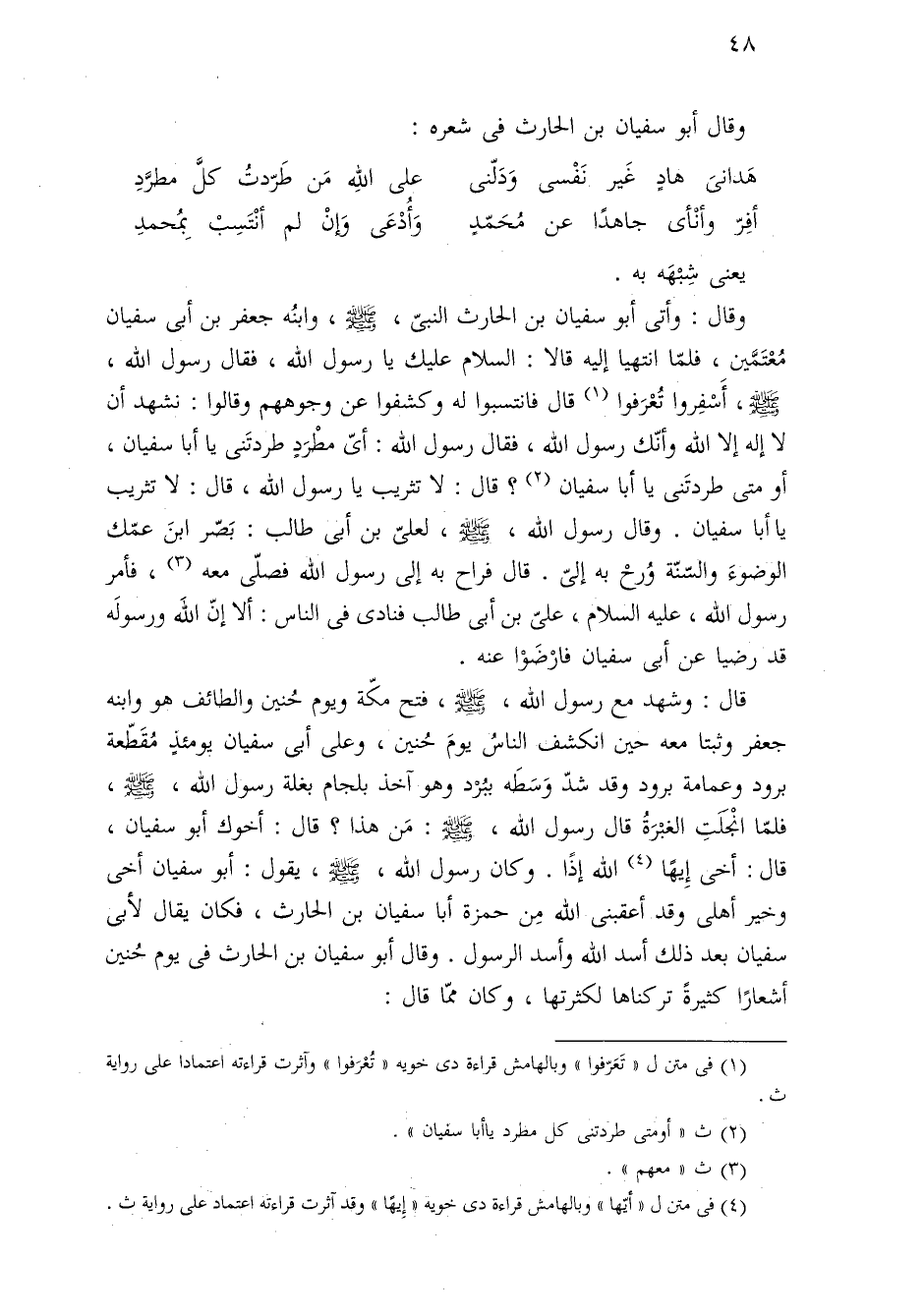 وقال: وأتي أبو سفيان بن الحارث النبيّ، -صلى الله عليه وسلم-، وابنُه جعفر بن أبي سفيان مُعْتَمَّين، فلمّا انتهيا إليه قالا: السلام عليك يا رسول الله، فقال رسول الله، -صلى الله عليه وسلم-، أَسْفِروا تُعْرَفوا (¬١) قال فانتسبوا له وكشفوا عن وجوههم وقالوا: نشهد أن لا إله إلا الله وأنّك رسول الله، فقال رسول الله: أىّ مطْرَدٍ طردتَني يا أبا سفيان، أو متي طردتَني يا أبا سفيان (¬٢)؟ قال: لا تثريب يا رسول الله، قال: لا تثريب يا أبا سفيان. وقال رسول الله، -صلى الله عليه وسلم-، لعليّ بن أبي طالب: بَصّر ابنَ عمّك الوضوءَ والسّنّة وُرحْ به إليّ. قال فراح به إلى رسول الله فصلَّي معه (¬٣)، فأمر رسول الله، عليه السلام، عليّ بن أبي طالب فنادى في الناس: ألا إنّ اللهَ ورسولَه قد رضيا عن أبي سفيان فارْضَوْا عنه.