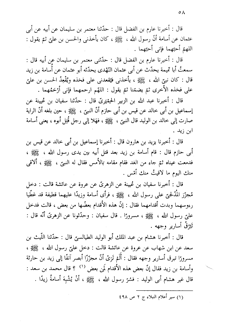 قال: أخبرنا سفيان بن عُيينة عن الزهريّ عن عروة عن عائشة قالت: دخل مُجزّز المُدْلجيّ على رسول الله، -صلى الله عليه وسلم-، فرأى أسامة وزيدًا عليهما قطيفة قد غطّيا رءوسهما وبدت أقدامهما فقال: إنّ هذه الأقدام بعضُها من بعض، قالت فدخل علىّ رسول الله، -صلى الله عليه وسلم-، مسرورًا. قال سفيان: وحدّثونا عن الزهرىّ أنّه قال: تَبْرُقُ أسارير وجهه.