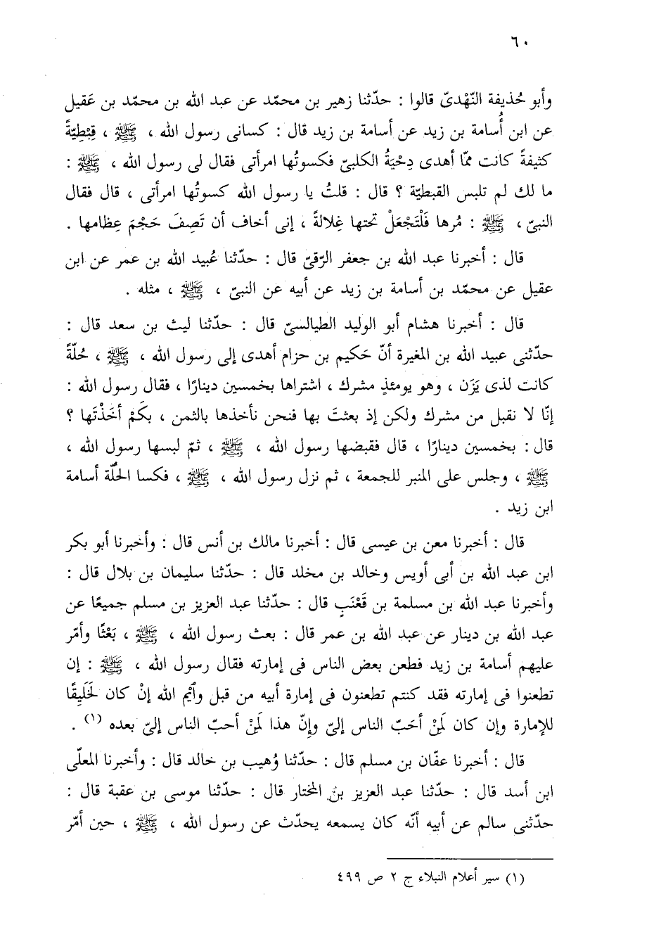 قال: أخبرنا عفّان بن مسلم قال: حدّثنا وُهيب بن خالد قال: وأخبرنا المعلّى ابن أسد قال: حدّثنا عبد العزيز بن المختار قال: حدّثنا موسى بن عقبة قال: حدّثنى سالم عن أبيه أنّه كان يسمعه يحدّث عن رسول الله، -صلى الله عليه وسلم-، حين أمّر