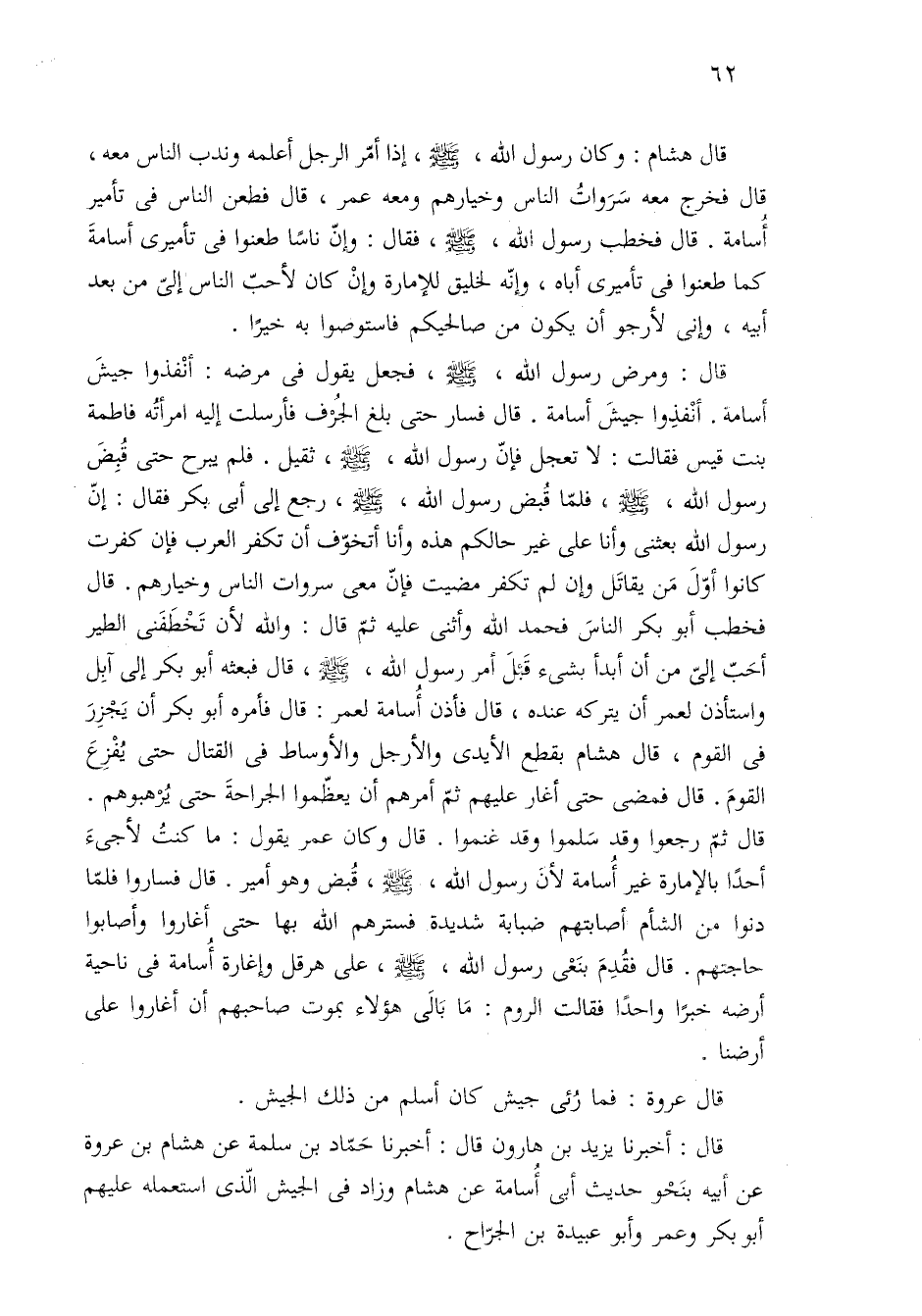 قال: ومرض رسول الله، -صلى الله عليه وسلم-، فجعل يقول فى مرضه: أنْفذوا جيشَ أسامة. أنْفذِوا جيشَ أسامة. قال فسار حتى بلغ الْجُرْف فأرسلت إليه امرأتُه فاطمة بنت قيس فقالت: لا تعجل فإنّ رسول الله، -صلى الله عليه وسلم-، ثقيل. فلم يبرح حتى قُبِضَ رسول الله، -صلى الله عليه وسلم-، فلمّا قُبض رسول الله، -صلى الله عليه وسلم-، رجع إلى أبي بكر فقال: إنّ رسول الله بعثنى وأنا على غير حالكم هذه وأنا أتخوّف أن تكفر العرب فإن كفرت كانوا أوّلَ مَن يقاتَل وإن لم تكفر مضيت فإنّ معى سروات الناس وخيارهم. قال فخطب أبو بكر الناسَ فحمد الله وأثنى عليه ثمّ قال: والله لأن تَخْطَفَنى الطير أحَبّ إليّ من أن أبدأ بشيء قَبْلَ أمر رسول الله، -صلى الله عليه وسلم-، قال فبعثه أبو بكر إلى آبِل واستأذن لعمر أن يتركه عنده، قال فأذن أُسامة لعمر: قال فأمره أبو بكر أن يَجْزِرَ فى القوم، قال هشام بقطع الأيدى والأرجل والأوساط فى القتال حتّى يُفْزِعَ القومَ. قال فمضى حتى أعار عليهم ثمّ أمرهم أن يعظّموا الجراحةَ حتى يُرْهبوهم. قال ثمّ رجعوا وقد سَلموا وقد غنموا. قال وكان عمر يقول: ما كنتُ لأجئَ أحدًا بالإمارة غير أُسامة لأنَ رسول الله، -صلى الله عليه وسلم-، قُبض وهو أمير. قال فساروا فلمّا دنوا من الشام أصابتهم ضبابة شديدة فسترهم الله بها حتى أغاروا وأصابوا حاجتهم. قال فقُدِمَ بنَعْى رسول الله، -صلى الله عليه وسلم-، على هرقل وإغارة أُسامة في ناحية أرضه خبرًا واحدًا فقالت الروم: مَا بَالَى هؤلاء بموت صاحبهم أن أغاروا على أرضنا.