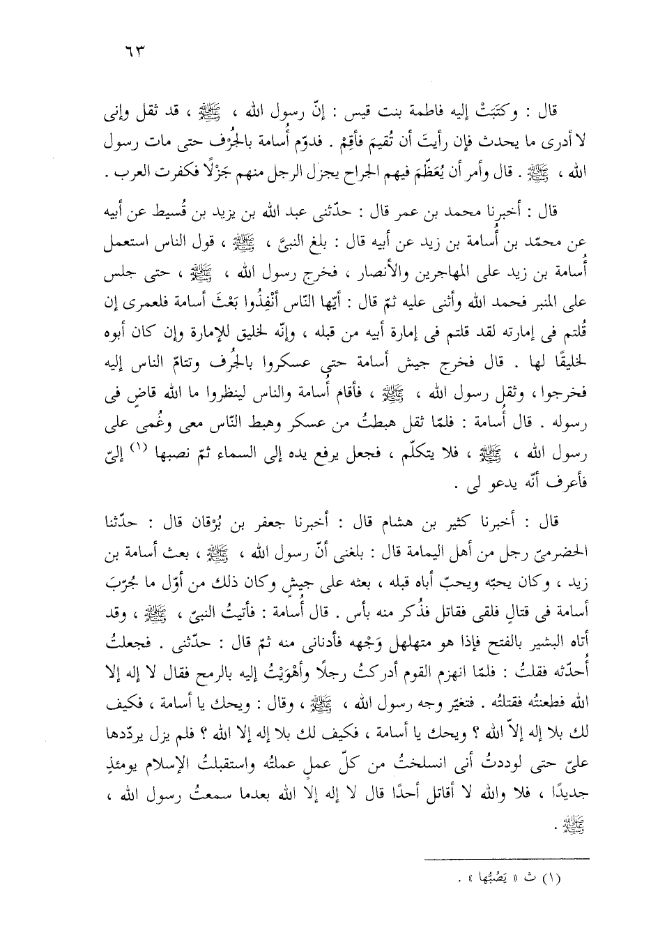 قال: أخبرنا كثير بن هشام قال: أخبرنا جعفر بن بُرْقان قال: حدّثنا الحضرميّ رجل من أهل اليمامة قال: بلغني أنَّ رسول الله، -صلى الله عليه وسلم-، بعث أسامة بن زيد، وكان يحبّه ويحبّ أباه قبله، بعثه على جيشٍ وكان ذلك من أوّل ما جُرّبَ أسامة في قتالٍ فلقى فقاتل فذُكر منه بأس. قال أُسامة: فأتيتُ النبيّ، -صلى الله عليه وسلم-، وقد أتاه البشير بالفتح فإذا هو متهلهل وَجْهه فأدناني منه ثمّ قال: حدّثني. فجعلتُ أُحدّثه فقلتُ: فلمّا انهزم القوم أدركتُ رجلًا وأهُوَيْتُ إليه بالرمح فقال لا إله إلا الله فطعنتُه فقتلتُه. فتغيّر وجه رسول الله، -صلى الله عليه وسلم-، وقال: ويحك يا أسامة، فكيف لك بلا إله إلّا الله؟ ويحك يا أسامة، فكيف لك بلا إله إلا الله؟ فلم يزل يردّدها علىّ حتى لوددتُ أني انسلختُ من كلّ عمل عملتُه واستقبلتُ الإسلام يومئذٍ جديدًا، فلا والله لا أقاتل أحدًا قال لا إله إلا الله بعدما سمعتُ رسول الله، -صلى الله عليه وسلم-.