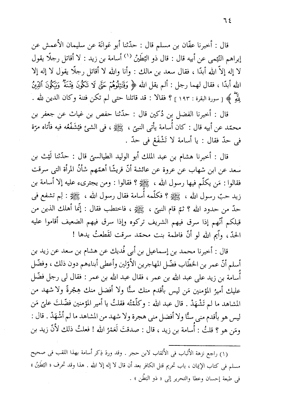 (¬١) راجع نزهة الألباب فى الألقاب لابن حجر. وقد وردَ ذِكر أسامة بهذا اللقب فى صحيح مسلم فى كتاب الإيمان، باب تحريم قتل الكافر بعد أن قال لا إله إلا الله. هذا وقد تحرف "البُطَينْ" فى طبعة إحسان وعطا والتحرير إلى "ذو البَطْن".