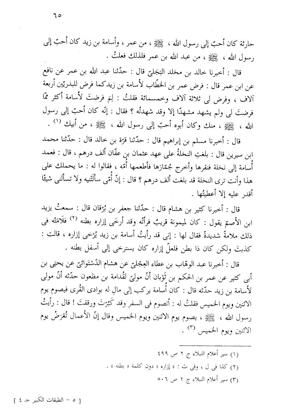 قال: أخبرنا خالد بن مخلد البَجَليّ قال: حدّثنا عبد الله بن عمر عن نافع عن ابن عمر قال: فرض عمر بن الخطّاب لأسامة بن زيد كما فرض للبدريّين أربعة آلاف، وفرض لي ثلاثة آلاف وخمسمائة فقلتُ: لِمَ فرضتَ لأسامة أكثر ممّا فرضتَ لى ولم يشهد مشهدًا إلا وقد شهدتُه؟ فقال: إنّه كان أحبّ إلى رسول الله، -صلى الله عليه وسلم-، منك وكان أبوه أحبّ إلى رسول الله، -صلى الله عليه وسلم-، من أبيك (¬١).