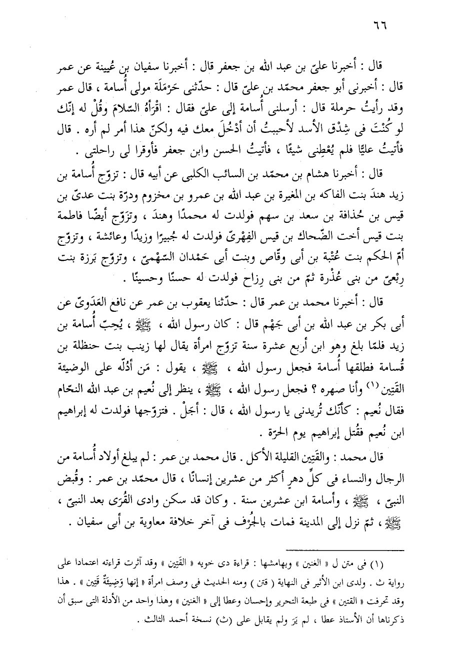 قال: أخبرنا محمد بن عمر قال: حدّثنا يعقوب بن عمر عن نافع العَدَويّ عن أبى بكر بن عبد الله بن أبى جَهْم قال: كان رسول الله، -صلى الله عليه وسلم-، يُحِبّ أُسامة بن زيد فلمّا بلغ وهو ابن أربع عشرة سنة تزوّج امرأة يقال لها زينب بنت حنظلة بن قُسامة فطلقها أُسامة فجعل رسول الله، -صلى الله عليه وسلم-، يقول: مَن أدُلّه على الوضيئة القَتِين (¬١) وأنا صهره؟ فجعل رسول الله، -صلى الله عليه وسلم-، ينظر إلى نُعيم بن عبد الله النحّام فقال نُعيم: كأنّك تُريدنى يا رسول الله، قال: أجَلْ. فتزوّجها فولدت له إبراهيم ابن نُعيم فقُتل إبراهيم يوم الحرّة.