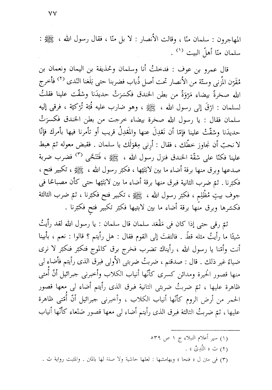 ثمّ رقى حتى إذا كان في مَقْعَد سلمان قال سلمان: يا رسول الله لقد رأيتُ شيئًا ما رأيتُ مثله قطّ. فالتفتَ إلى القوم فقال: هل رأيتم؟ قالوا: نعم، بأبينا أنت وأمّنا يا رسول الله، رأيناك تضرب فخرج برق كالموج فتكبّر فنكبّر لا نرى ضياءً غير ذلك. قال: صدقتم، ضربتُ ضربتى الأولى فبرق الذى رأيتم فأضاء لى منها قصور الْحيرة ومدائن كسرى كأنّها أنياب الكلاب وأخبرنى جبرائيل أنّ أُمتى ظاهرة عليها، ثمّ ضربتُ ضربتى الثانية فبرق الذى رأيتم أضاء لى معها قصور الحمر من أرض الروم كأنّها أنياب الكلاب، وأخبرنى جبرائيل أنّ أمّتى ظاهرة عليها، ثمّ ضربتُ الثالثة فبرق الذى رأيتم أضاء لى معها قصور صَنْعاء كأنّها أنياب