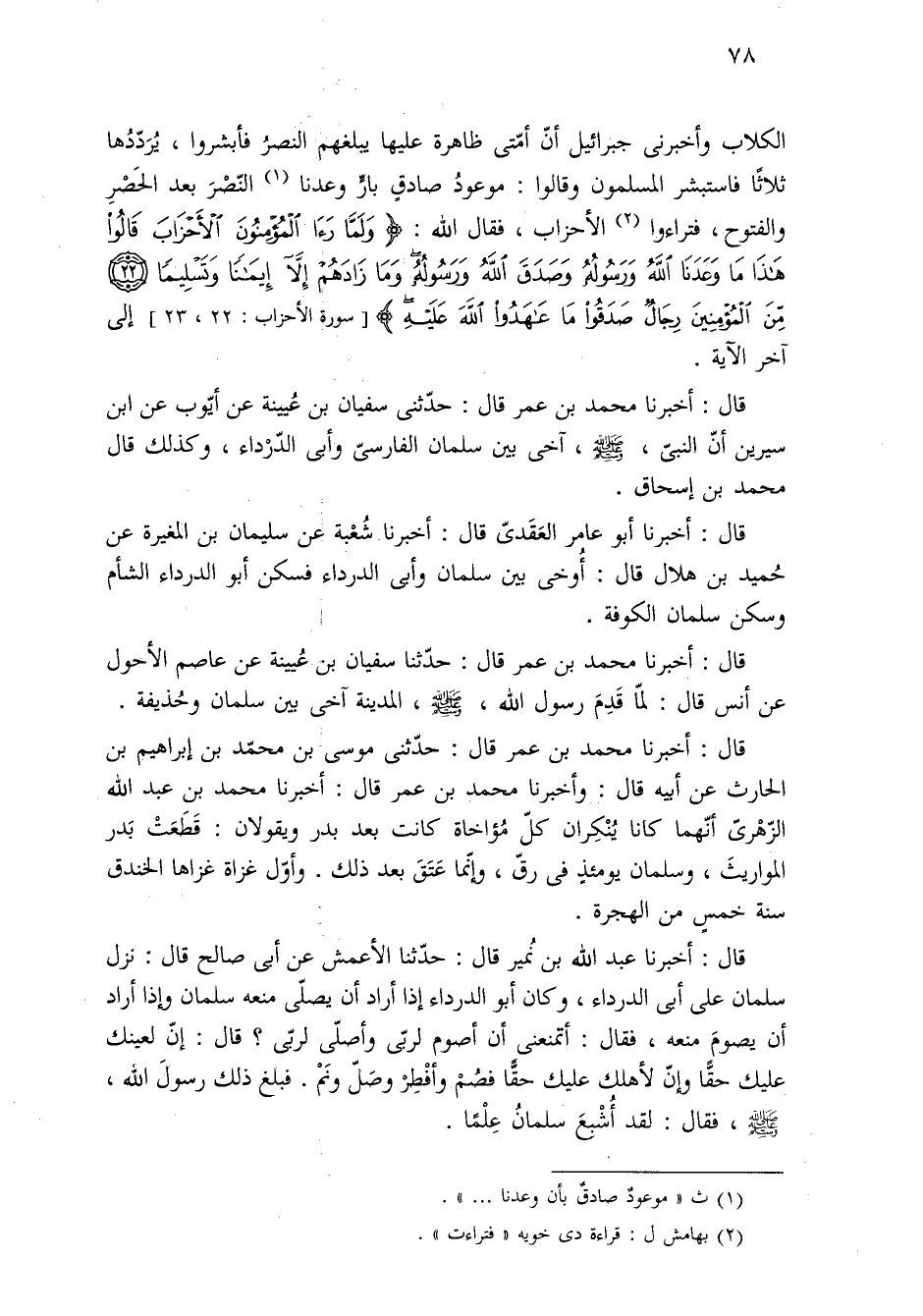 قال: أخبرنا محمد بن عمر قال: حدّثنى موسى بن محمّد بن إبراهيم بن الحارث عن أبيه قال: وأخبرنا محمد بن عمر قال: أخبرنا محمد بن عبد الله الزّهْرىّ أنّهما كانا يُنْكِران كلّ مُؤاخاة كانت بعد بدر ويقولان: قَطَعَتْ بَدر المواريثَ، وسلمان يومئذٍ في رقّ، وإنّما عَتَقَ بعد ذلك. وأوّل غزاة غزاها الخندق سنة خمسٍ من الهجرة.