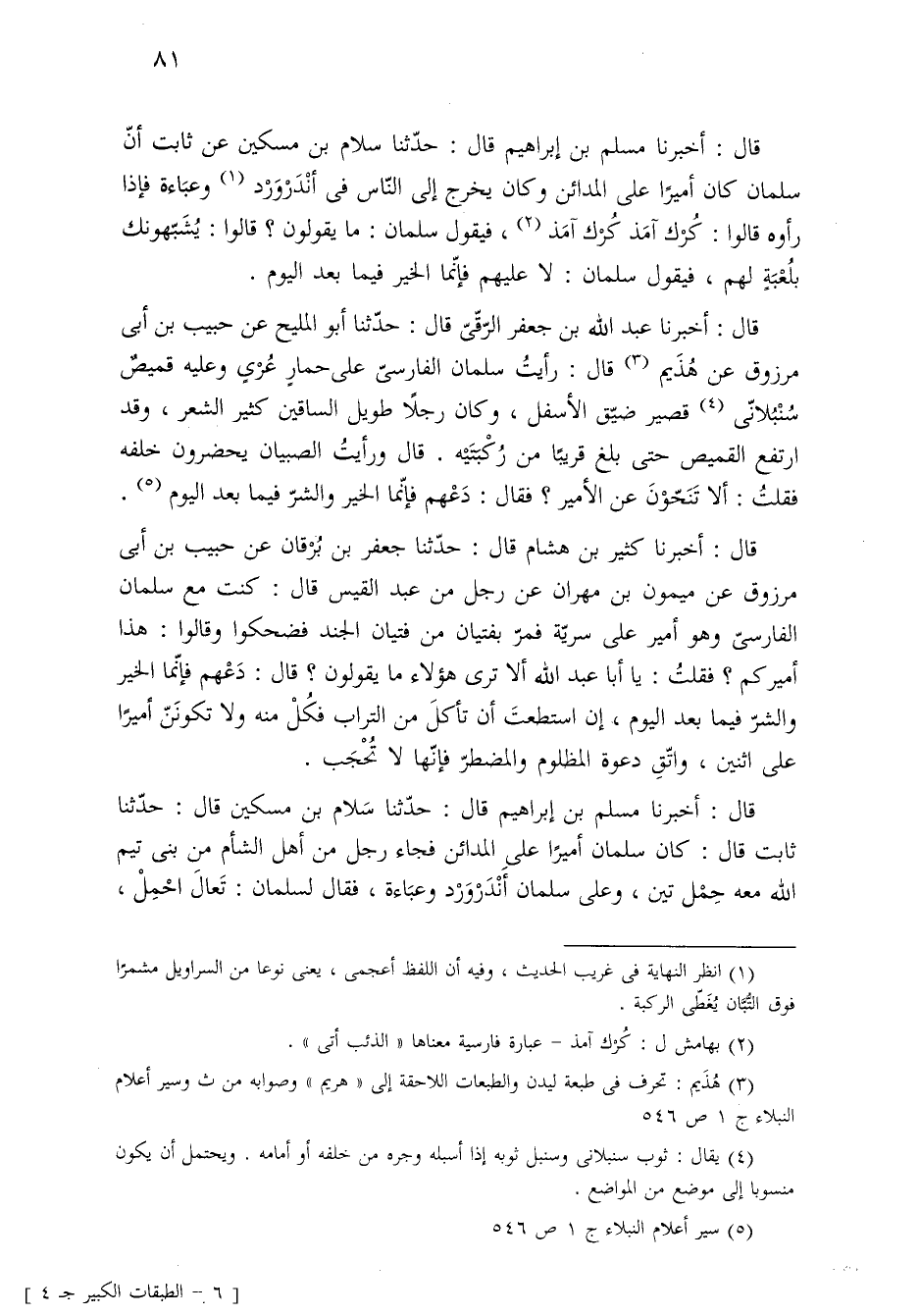 قال: أخبرنا مسلم بن إبراهيم قال: حدّثنا سَلام بن مسكين قال: حدّثنا ثابت قال: كان سلمان أميرًا على المدائن فجاء رجل من أهل الشام من بنى تيم الله معه حِمْل تين، وعلى سلمان أَنْدَرْوَرْد وعبَاءة، فقال لسلمان: تَعالَ احْمِلْ،