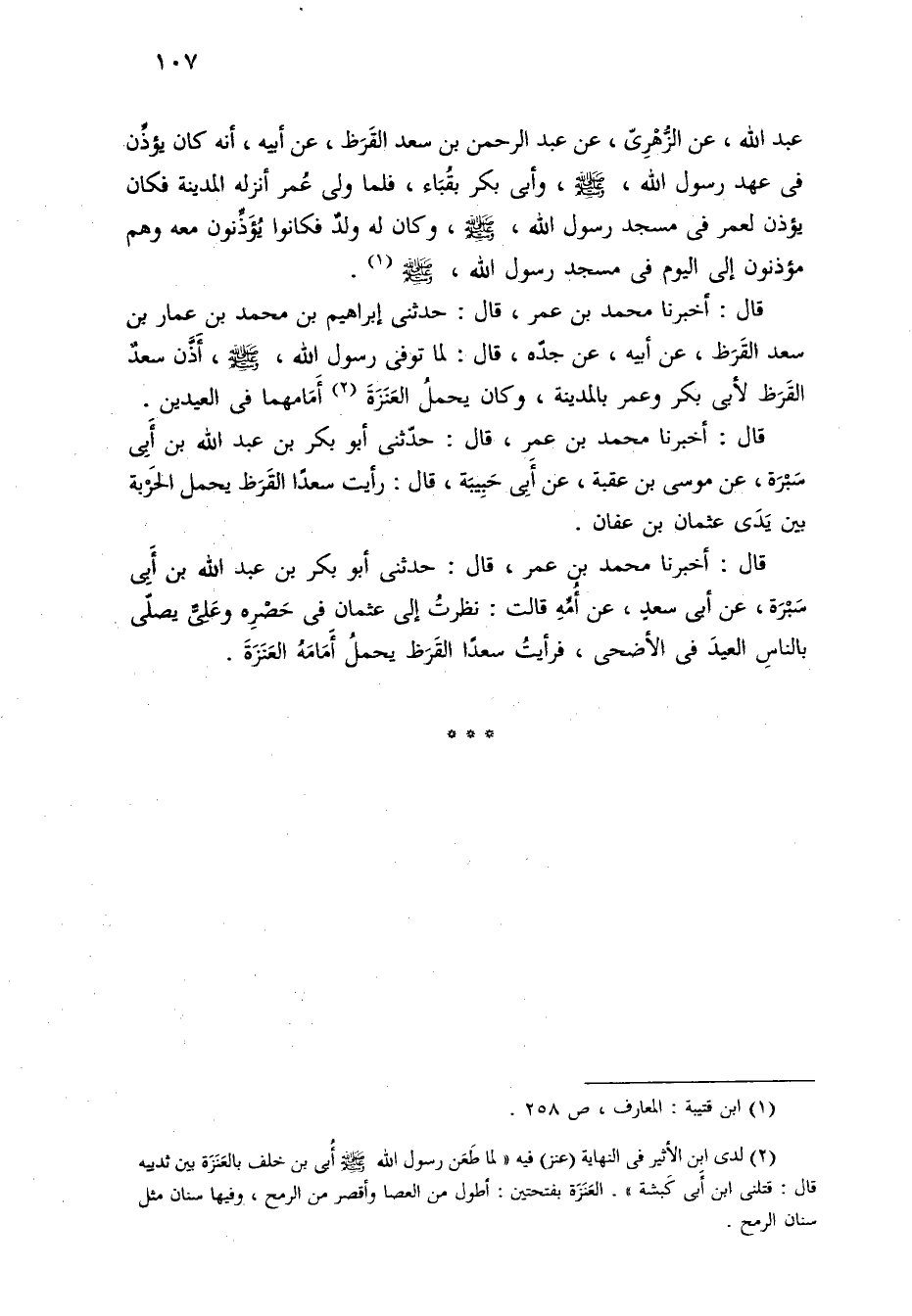 قال: أحبرنا محمد بن عمر، قال: حدثنى أبو بكر بن عبد الله بن أَبِى سَبْرَة، عن أبي سعدٍ، عن أُمِّهِ قالت: نظرتُ إلى عثمان في حَصْرِه وعَليٌّ يصلّى بالناسِ العيدَ في الأضحى، فرأيتُ سعدًا القَرَظ يحملُ أَمَامَهُ العَنَزَةَ.