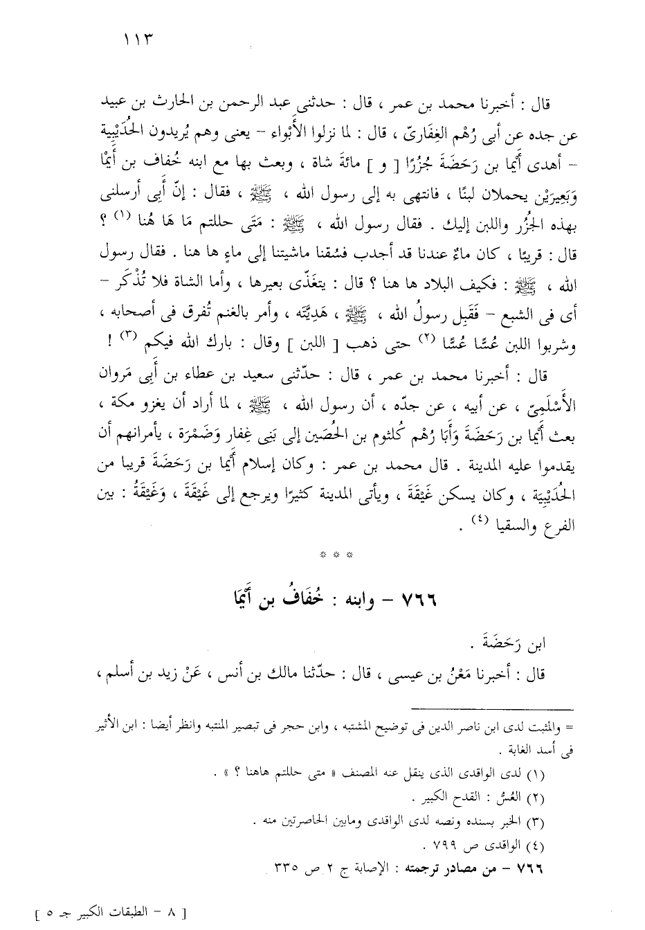 قال: أخبرنا محمد بن عمر، قال: حدثنى عبد الرحمن بن الحارث بن عبيد عن جده عن أبي رُهْم الغِفَاريّ، قال: لا نزلوا الأَبْواء - يعني وهم يُريدون الحُدَيْبِية - أهدى أَيْما بن رَحَضَةَ جُزُزًا [و] مائةَ شاة، وبعث بها مع ابنه خُفاف بن أَيْما وَبَعِيرَيْن يحملان لبنًا، فانتهى به إلى رسول الله، - صلى الله عليه وسلم -، فقال: إنّ أَبِى أرسلنى بهذه الجُزُر واللبن إليك. فقال رسول الله، - صلى الله عليه وسلم -: مَتَى حللتم مَا هَا هُنا (¬١)؟ قال: قريبًا، كان ماءٌ عندنا قد أجدب فسُقنا ماشيتنا إلى ماءٍ ها هنا. فقال رسول الله، - صلى الله عليه وسلم -: فكيف البلاد ها هنا؟ قال: يتغَذّى بعيرها، وأما الشاة فلا تُذْكَر - أي في الشبع - فَقَبِل رسولُ الله، - صلى الله عليه وسلم -، هَدِيَّتَه، وأمر بالغنم تُفرق في أصحابه، وشربوا اللبن عُسًّا عُسًّا (¬٢) حتى ذهب [اللبن] وقال: بارك الله فيكم (¬٣)!