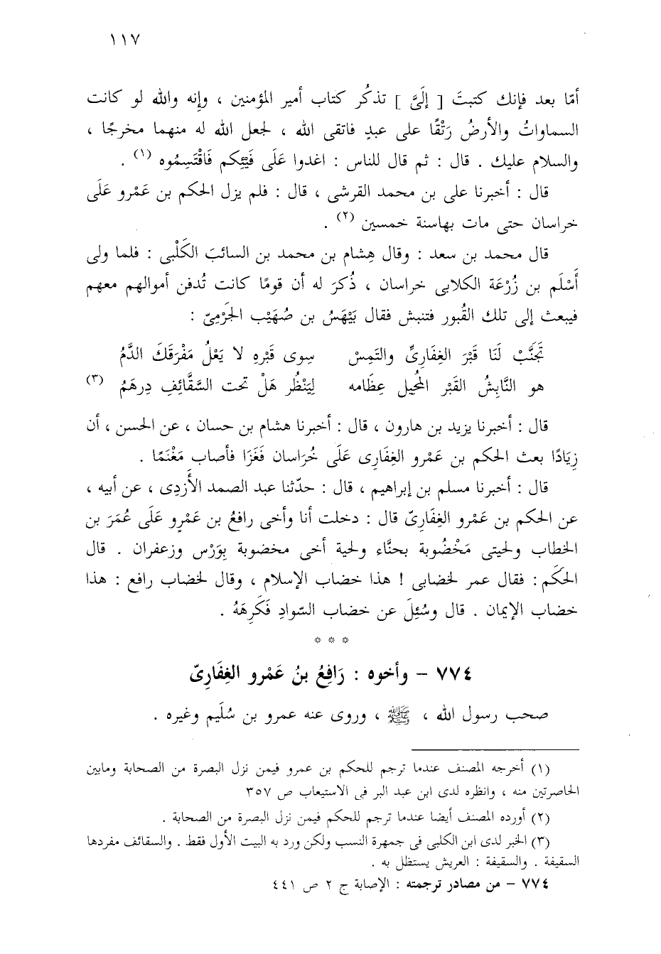 (¬١) أخرجه المصنف عندما ترجم للحكم بن عمر، فيمن نزل البصرة من الصحابة وما بين الحاصرتين منه، وانظره لدى ابن عبد البر في الاستيعاب ص ٣٥٧.