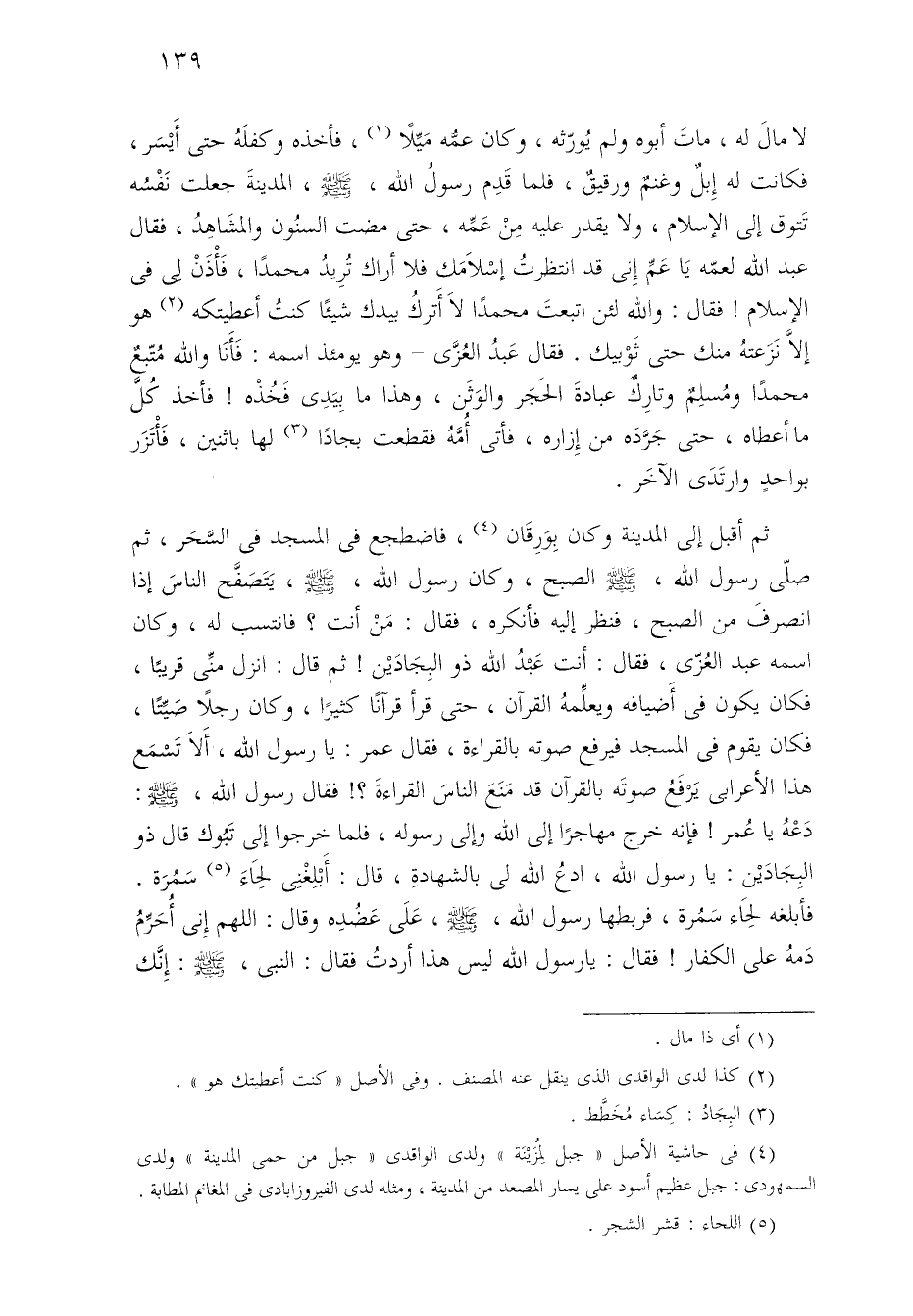 ثم أقبل إلى المدينة وكان بِوَرِقَان (¬٤)، فاضطجع في المسجد في السَّحَر، ثم صلّى رسول الله، - صلى الله عليه وسلم - الصبح، وكان رسول الله، - صلى الله عليه وسلم -، يَتَصَفَّح الناسَ إذا انصرفَ من الصبح، فنظر إليه فأنكره، فقال: مَنْ أنت؟ فانتسب له، وكان اسمه عبد العُزّى، فقال: أنت عَبْدُ الله ذو البِجَادَيْن! ثم قال: انزل منِّى قريبًا، فكان يكون في أَضيافه ويعلِّمهُ القرآن، حتى قرأ قرآنًا كثيرًا، وكان رجلًا صَيِّتًا، فكان يقوم في المسجد فيرفع صوته بالقراءة، فقال عمر: يا رسول الله، أَلَا تَسْمَع هذا الأعرابي يَرْفع صوتَه بالقرآن قد مَنَعَ الناسَ القراءةَ؟ ! فقال رسول الله، - صلى الله عليه وسلم -: دَعْهُ، عُمر! فإنه خرج مهاجرًا إلى ادعُ وإلى رسوله، فلما خرجوا إلى تَبُوك قال ذو البِجَادَيْن: يا رسول الله، ادعُ الله لي بالشهادةِ، قال: أَبْلِغْنِى لِحَاءَ (¬٥) سَمُرَة. فأبلغه لِحَاء سَمُرة، فربطها رسول الله، - صلى الله عليه وسلم -، عَلَى عَضُدِه وقال: اللهم إِنى أُحَرِّمُ دَمهُ على الكفار! فقال: يا رسول الله ليس هذا أردتُ فقال: النبي، - صلى الله عليه وسلم -: إِنَّك