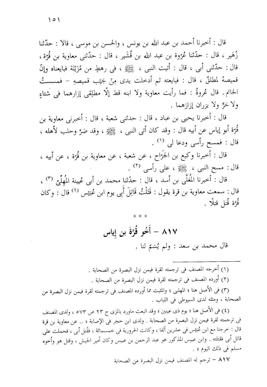 قات: أخبرنا أحمد بن عبد الله بن يونس، والحسن بن موسى، قالا: حدّثنا زُهَير، قال: حدّثنا عُرْوة بن عبد الله بن قُشَير، قال: حدّثني معاوية بن قُرَّة، قال: حدّثني أبى، قال: أتيت النبي، - صلى الله عليه وسلم -، في رهطٍ من مُزَيْنَة فبايعناه وإنّ قميصهُ لمطلقٌ، قال: فبايعته ثم أدخلت يدى مِنْ جَيْب قميصهِ - فمسستُ الخاتم. قال عُروةُ: فما رأيت معاوية ولا ابنه قط إلّا مطلِقى إزارهما في شتاءٍ ولا حَرٍّ ولا يزران إزارَهما.