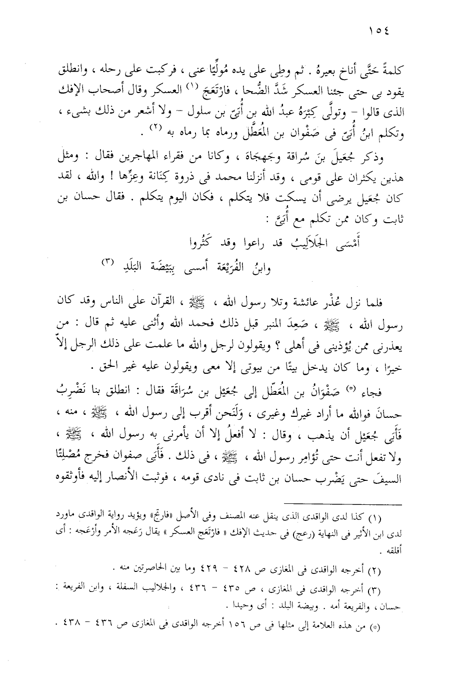فجاء (*) صَفْوَانُ بن المُعَطّل إلى جُعَيْل بن سُرَاقَة فقال: انطلق بنا نَضْرِب حسانَ فوالله ما أراد غيرك وغيرى، وَلَنَحن أقرب إلى رسول الله، - صلى الله عليه وسلم -، منه، فَأَبَي جُعَيْل أن يذهب، وقال: لا أفعل إلَّا أن يأمرنى به رسول الله، - صلى الله عليه وسلم -، ولا تفعل أنت حتى تُؤامِر رسول - صلى الله عليه وسلم -، في ذلك. فَأَبَى صفوان فخرج مُصْلِتًا السيفَ حتى يَضْرب حسان بن ثابت في نادى قومه، فوثبت الأنصار إليه فأوثقوه