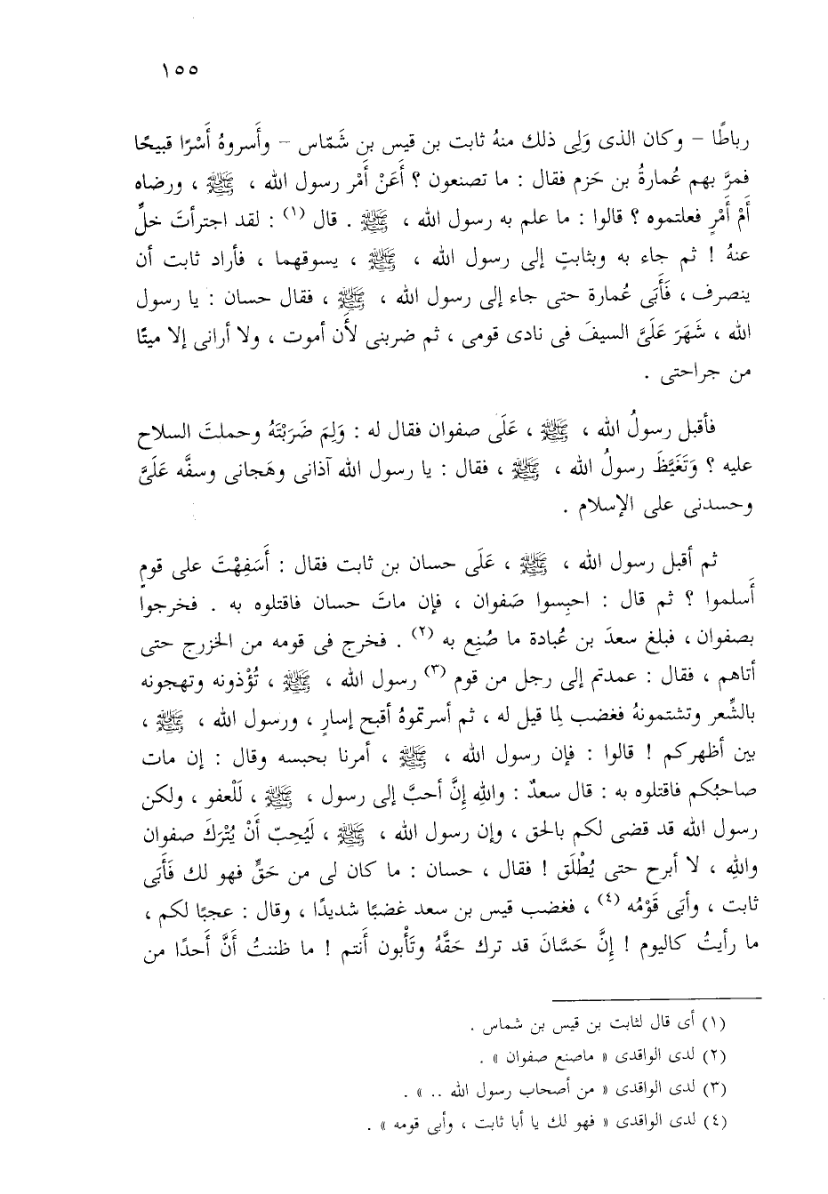 ثم أقبل رسول الله، - صلى الله عليه وسلم -، عَلَى حسان بن ثابت فقال: أَسَفِهْتَ على قومٍ أَسلموا؟ ثم قال: احبِسوا صَفوان، فإن ماتَ حسان فاقتلوه به. فخرجوا بصفوان، فبلغ سعدَ بن عُبادة ما صُنع به (¬٢). فخرج في قومه من الخزرج حتى أتاهم، فقال: عمدتم إلى رجل من قوم (¬٣) رسول الله، - صلى الله عليه وسلم -، تُؤذونه وتهجونه بالشِّعر وتشتمونهُ فغضب لِما قيل له، ثم أسرتموهُ أقبح إسارٍ، ورسول الله، - صلى الله عليه وسلم -، بين أظهركم! قالوا: فإن رسول الله، - صلى الله عليه وسلم -، أمرنا بحبسه وقال: إن مات صاحبُكم فاقتلوه به: قال سعدٌ: واللهِ إِنَّ أحبَّ إلى رسول، - صلى الله عليه وسلم -، لَلْعفو، ولكن رسول الله قد قضى لكم بالحق، وإن رسول الله، - صلى الله عليه وسلم -، لَيُحِبّ أَنْ يُتْرَكَ صفوان واللهِ، لا أبرح حتى يُطْلَق! فقال، حسان: ما كان لي من حَقٍّ فهو لك فَأَيَ ثابت، وأبَى قَوْمُه (¬٤)، فغضب قيس بن سعد غضبًا شديدًا، وقال: عجبًا لكم، ما رأيتُ كاليوم! إِنَّ حَسَّانَ قد ترك حَقَّهُ وتَأْبون أَنتم! ما ظننتُ أَنَّ أَحدًا من