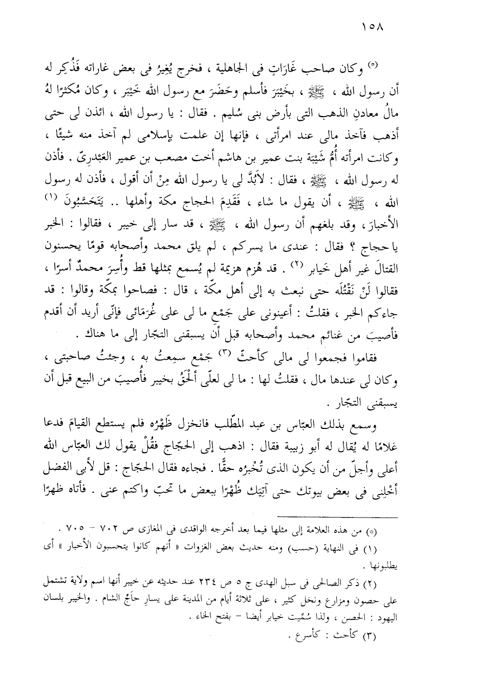 (*) وكان صاحب غَارَاتٍ في الجاهلية، فخرج يُغِيرُ في بعض غاراته فَذُكِر له أن رسول الله، - صلى الله عليه وسلم -، بخَيْبَرَ فأسلم وحَضَرَ مع رسول الله خَيْبَر، وكان مُكثرًا لهُ مالُ معادنِ الذهب التي بأرض بنى سُليم. فقال: يا رسول الله، ائذن لي حتى أذهب فآخذ مالى عند امرأتي، فإنها إن علمت بإسلامي لم آخذ منه شيئًا، وكانت امرأته أُمُّ شَيْبَة بنت عمير بن هاشم أخت مصعب بن عمير العَبْدرِيّ. فأذن له رسول الله، - صلى الله عليه وسلم -، فقال: لَابُدَّ لي يا رسول الله مِنْ أن أقول، فأذن له رسول الله، - صلى الله عليه وسلم -، أن يقول ما شاء، فَقَدِمَ الحجاج مكة وأهلها .. يَتَحَسَّبُونَ (¬١) الأخبارَ، وقد بلغهم أن رسول الله، - صلى الله عليه وسلم -، قد سار إلى خيبر، فقالوا: الخبر يا حجاج؟ فقال: عندي ما يسركم، لم يلق محمد وأصحابه قومًا يحسنون القتالَ غير أهل خَيابر (¬٢). قد هُزم هزيمة لم يُسمع بمثلها قط وأُسِرَ محمدٌ أسرًا، فقالوا لَنْ نَقْتُلَه حتى نبعث به إلى أهل مكّة، قال: فصاحوا بمكّة وقالوا: قد جاءكم الخبر، فقلتُ: أعينونى على جَمْعِ ما لي على غُرَمَائى فإنّى أريد أن أقدم فأصيبَ من غنائم محمد وأصحابه قبل أن يسبقنى التجّار إلى ما هناك.