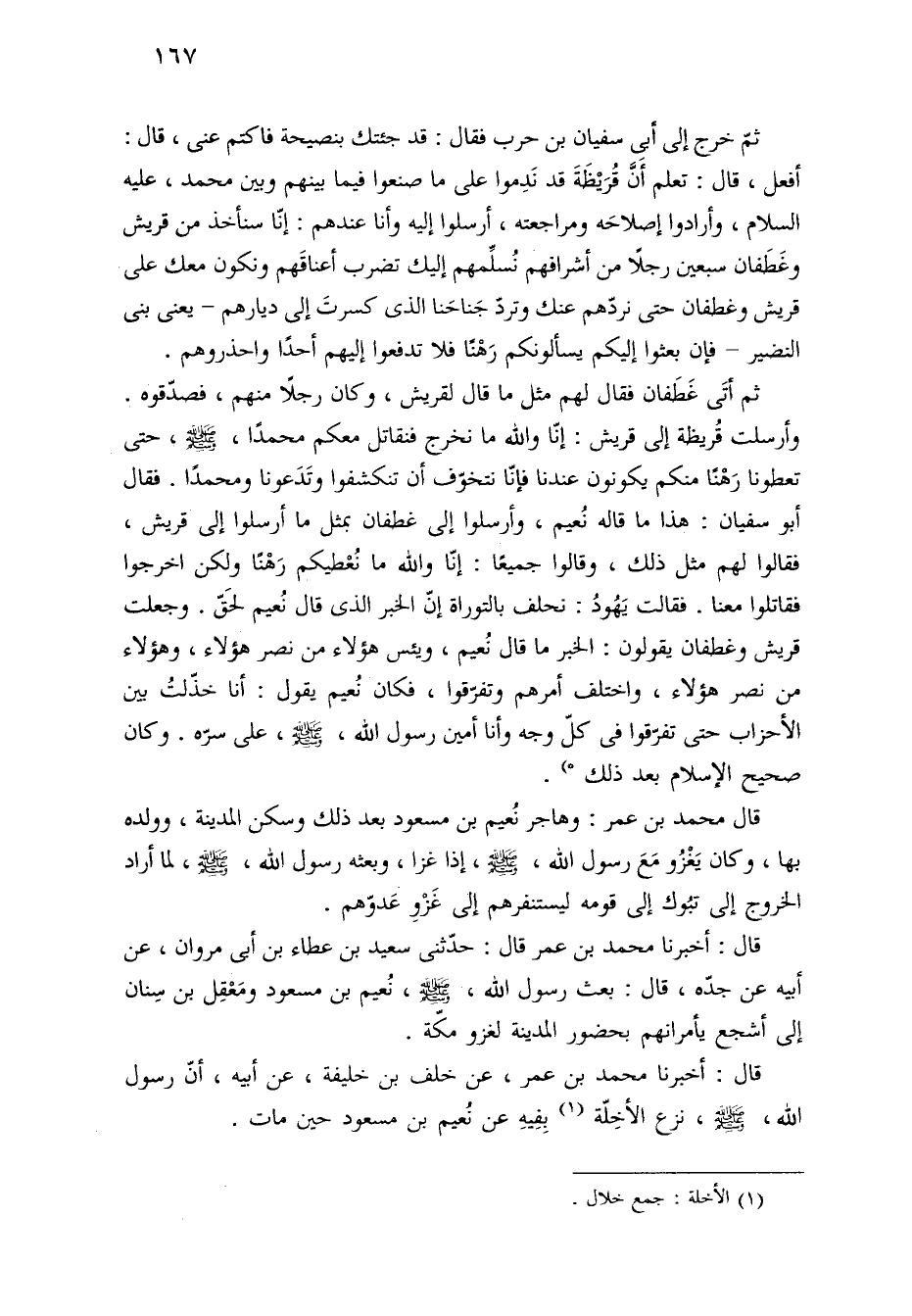 وأرسلت قُريظة إلى قريش: إنّا والله ما نخرج فنقاتل معكم محمدًا، - صلى الله عليه وسلم -، حتى تعطونا رَهْنًا منكم يكونون عندنا فإنّا نتخوّف أن تنكشفوا وتَدَعونا ومحمدًا. فقال أبو سفيان: هذا ما قاله نُعيم، وأرسلوا إلى غطفان بمثل ما أرسلوا إلى قريش، فقالوا لهم مثل ذلك، وقالوا جميعًا: إنّا والله ما نُعْطيكم رَهْنًا ولكن اخرجوا فقاتلوا معنا. فقالت يَهُودُ: نحلف بالتوراة إنّ الخبر الذي قال نُعيم لحَقّ. وجعلت قريش وغطفان يقولون: الخبر ما قال نُعيم، ويئس هؤلاء من نصر هؤلاء، وهؤلاء من نصر هؤلاء، واختلف أمرهم وتفرّقوا، فكان نُعيم يقول: أنا خذّلتُ بين الأحزاب حتى تفرّقوا في كلّ وجه وأنا أمين رسول الله، - صلى الله عليه وسلم -، على سرّه. وكان صحيح الإسلام بعد ذلك *).