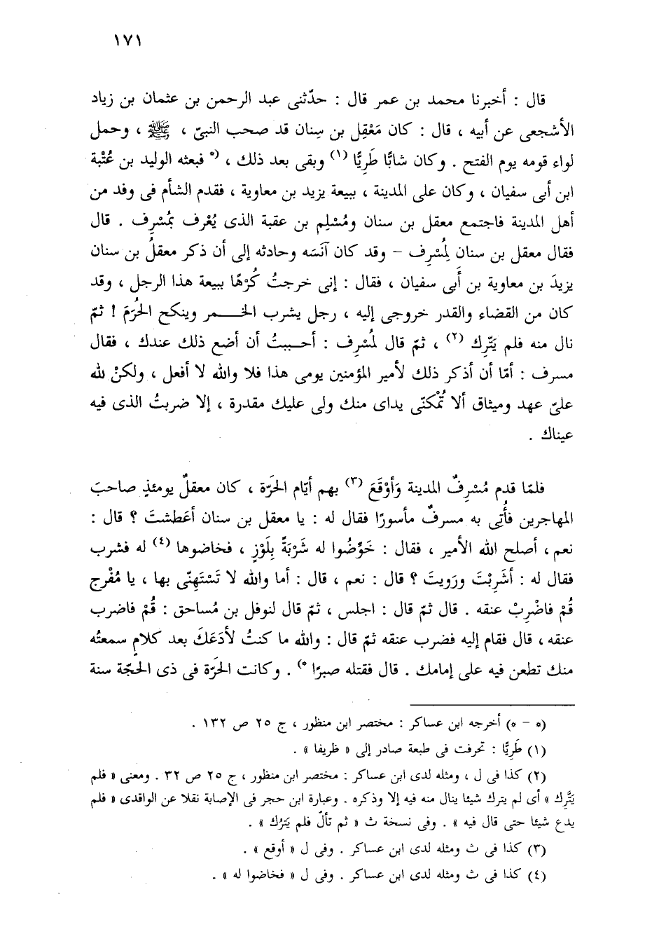 فلمّا قدم مُشرِفٌ المدينة وَأوْقَعَ (¬٣) بهم أيّام الحَرّة، كان معقل يومئذٍ صاحبَ المهاجرين فأُتِى به مسرفٌ مأسورًا فقال له: يا معقل بن سنان أعَطشتَ؟ قال: نعم، أصلح الله الأمير، فقال: خَوِّضُوا له شَرْبَةً بِلَوْزٍ، فخاضوها (¬٤) له فشرب فقال له: أشَرِبْتَ ورَويتَ؟ قال: نعم، قال: أما والله لا تَسْتَهِنّى بها، يا مُفْرج قُمْ فاضْرِبْ عنقه. قال ثمّ قال: اجلس، ثمّ قال لنوفل بن مُساحق: قُمْ فاضرب عنقه، قال فقام إليه فضرب عنقه ثمّ قال: والله ما كنتُ لأدَعَكَ بعد كلامٍ سمعتُه منك تطعن فيه على إمامك. قال فقتله صبرًا] *). وكانت الحَرّة في ذى الحجّة سنة