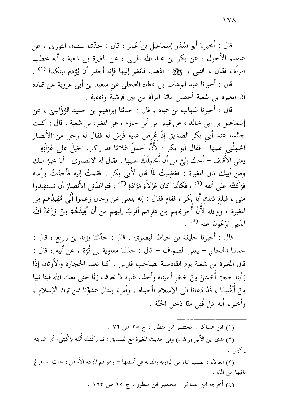 قال: أخبرنا خليفة بن خياط البصرى، قال: حدّثنا يزيد بن زريع، قال: حدّثنا الحجاج - يعني الصواف - قال: حدّثنا معاوية بن قُرَّة، عن أبيه، قال: قال المغيرة بن شعبة يوم القادسية لصاحب فارس: كنا نعبد الحجارة والأوثان إذَا رَأينا حجرًا أَحْسَنَ مِنْ حَجَرٍ ألقيناه وأخذنا غيره لا نعرف رَبًّا حتى بعث الله فينا نبيا مِنْ أَنْفُسِنَا، قَدْ دَعانا إلى الإسلام فأجبناه، وأمرنا بقتال عدوِّنا ممن ترك الإسلام، وأخبرنا أنَّه مَنْ قُتِل منّا دَخل الجنَّة.