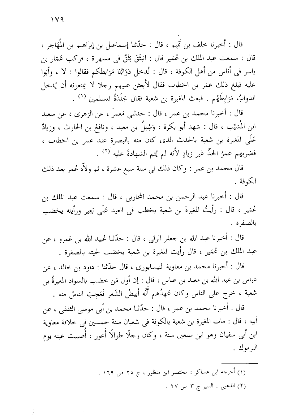 قال: أخبرنا عبد الله بن جعفر الرقى، قال: حدّثنا عُبيد الله بن عَمرو، عن عبد الملك بن عُمَير، قال رأيت المغيرة بن شعبة يخضب لحيته بالصفرة.