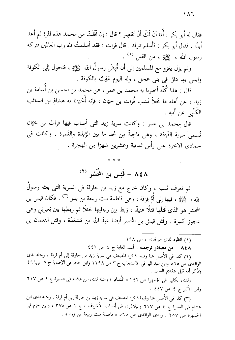 قال: هذا كُلّه أخبرنا به محمد بن عمر، عن محمد بن الحسن بن أُسامة بن زيد، عن أهله مَا خَلَا نَسَب فُرات بن حيّان، فإنَّه أَخْبَرَنا به هشامُ بن السائب الكَلْبِى عن أبيه.