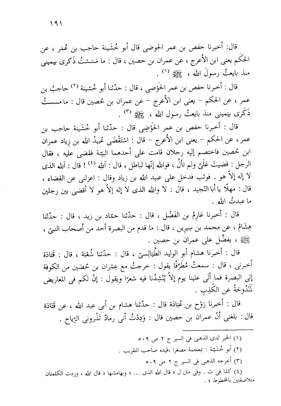 قال: أخبرنا حفص بن عمر الحوضى قال أبو خُشَينة حاجب بن عُمَر، عن الحكَم يعني ابن الأعرج، عن عمران بن حصين، قال: ما مَسَسْتُ ذَكرى بيمينى منذ بايعتُ رسولَ الله، - صلى الله عليه وسلم - (¬١).