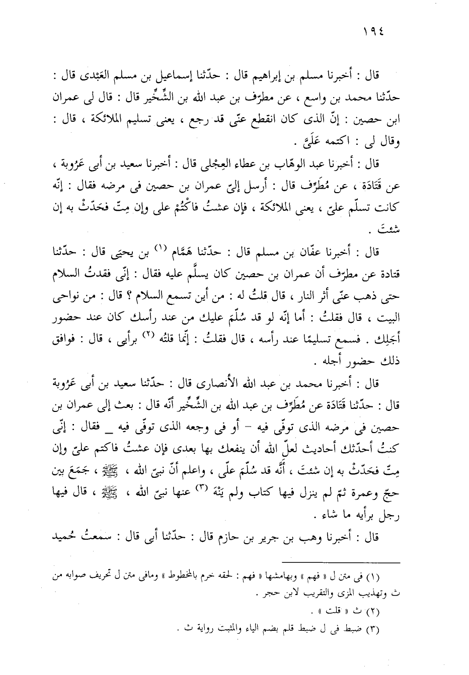 قال: أخبرنا مسلم بن إبراهيم قال: حدّثنا إسماعيل بن مسلم العَبْدى قال: حدّثنا محمد بن واسع، عن مطرّف بن عبد الله بن الشِّخِّير قال: قال لي عمران بن حصين: إنّ الذي كان انقطع عنّى قد رجع، يعني تسليم الملائكة، قال: وقال لي: اكتمه عَلَيَّ.