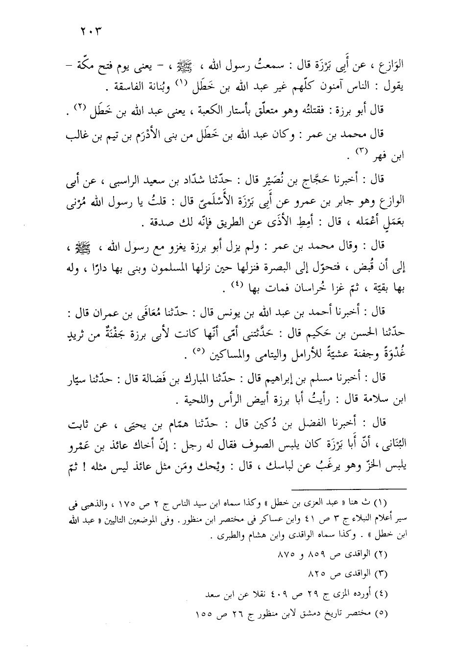 (¬١) ث هنا " عبد العزى بن خطل" وكذا سماه ابن سيد الناس ج ٢ ص ١٧٥، والذهبى في سير أعلام النبلاء ج ٣ ص ٤١ وابن عساكر في مختصر ابن منظور. وفى الموضعين التاليين "عبد الله بن خطل". وكذا سماه الواقدي وابن هشام والطبرى.