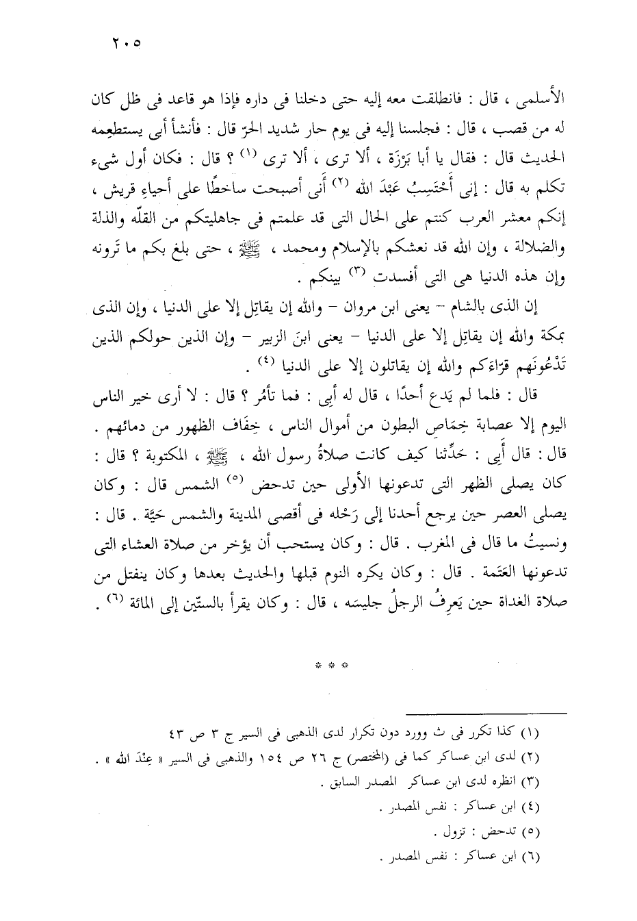 الأسلمى، قال: فانطلقت معه إليه حتى دخلنا في داره فإذا هو قاعد في ظل كان له من قصب، قال؟ فجلسنا إليه في يوم حار شديد الحرّ قال. فأنشأ أبي يستطعِمه الحديث قال: فقال يا أبا بَرْزَة، ألا ترى، ألا ترى (¬١)؟ قال: فكان أول شئ تكلم به قال: إنى أَحْتَسِبُ عَبْدَ الله (¬٢) أَنى أصبحت ساخطًا على أحياءِ قريش، إنكم معشر العرب كنتم على الحال التي قد علمتم في جاهليتكم من القلّة والذلة والضلالة، وإن الله قد نعشكم بالإسلام ومحمد، - صلى الله عليه وسلم -، حتى بلغ بكم ما تَرونه وإن هذه الدنيا هي التي أفسدت (¬٣) بينكم.