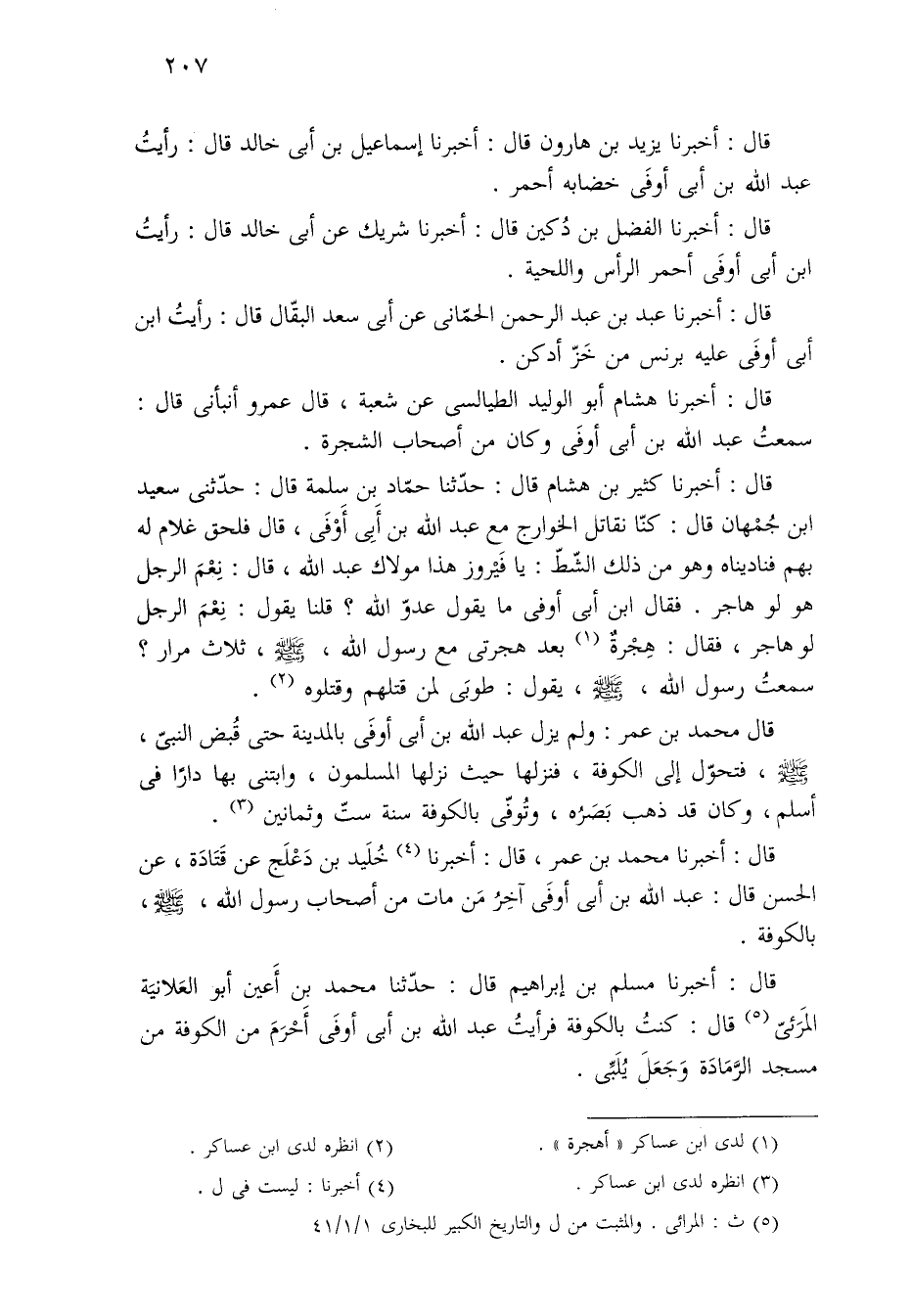 قال: أخبرنا مسلم بن إبراهيم قال: حدّثنا محمد بن أَعين أبو العَلانيَة المرَئيّ (¬٥) قال: كنتُ بالكوفة فرأيتُ عبد الله بن أبي أوفى أَحْرَمَ من الكوفة من مسجد الرَّمَادَة وَجَعَلَ يُلَبِّى.