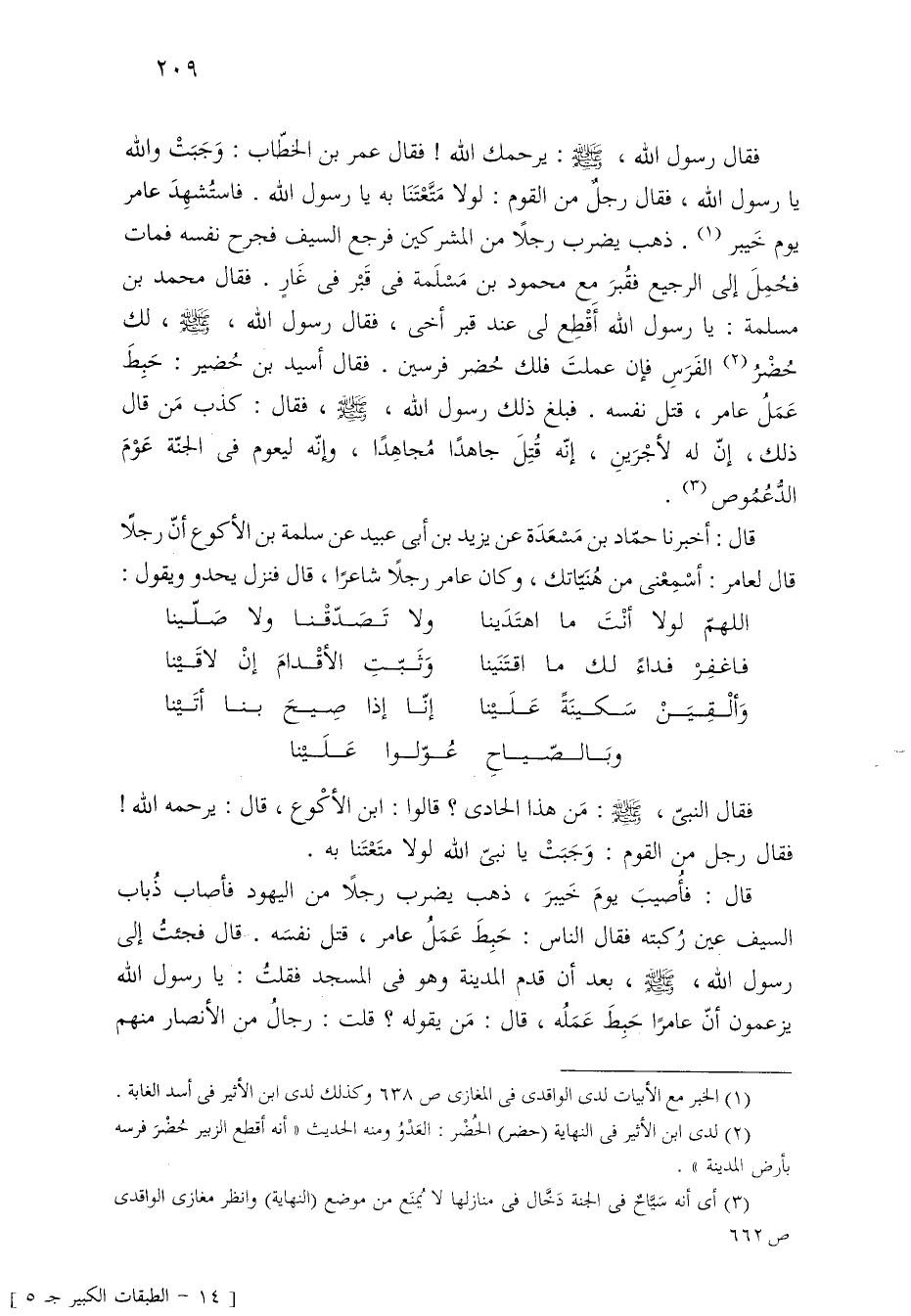 قال: فأُصيبَ يومَ خَيبرَ، ذهب يضرب رجلًا من اليهود فأصاب ذُباب السيف عين رُكبته فقال الناس: حَبِطَ عَمَلُ عامر، قتل نفسَه. قال فجئتُ إلى رسول الله، - صلى الله عليه وسلم -، بعد أن قدم المدينة وهو في المسجد فقلتُ: يا رسول الله يزعمون أنّ عامرًا حَبِطَ عَمَلُه، قال: مَن يقوله؟ قلت: رجالُ من الأنصار منهم