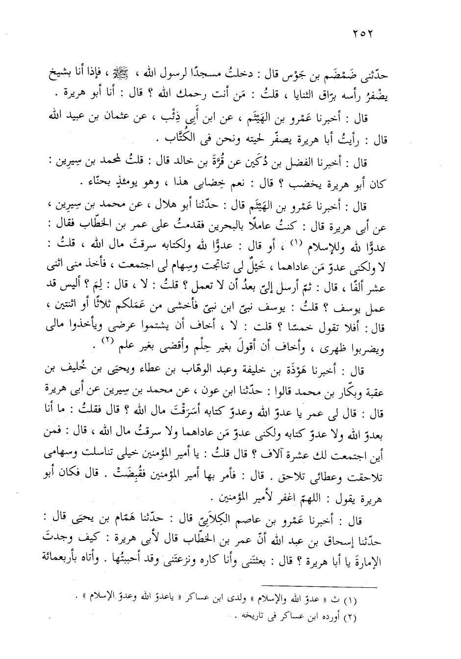 قال: أخبرنا هَوْذَة بن خليفة وعبد الوهّاب بن عطاء ويحيىَ بن خُليف بن عقبة وبكّار بن محمّد قالوا: حدّثنا ابن عون، عن محمّد بن سِيرين عن أبي هريرة قال: قال لي عمر يا عدوّ الله وعدوّ كتابه أسَرَقْتَ مال الله؟ قال فقلتُ: ما أنا بعدوّ الله ولا عدوّ كتابه ولكنى عدوّ مَن عاداهما ولا سرقتُ مال الله، قال: فمن أين اجتمعت لك عشرة آلاف؟ قال قلتُ: يا أمير المؤمنين خيلى تناسلت وسهامى تلاحقت وعطائى تلاحق. قال: فأمر بها أمير المؤمنين فقُبِضَتْ. قال فكان أبو هريرة يقول: اللهمّ اغفر لأمير المؤمنين.
