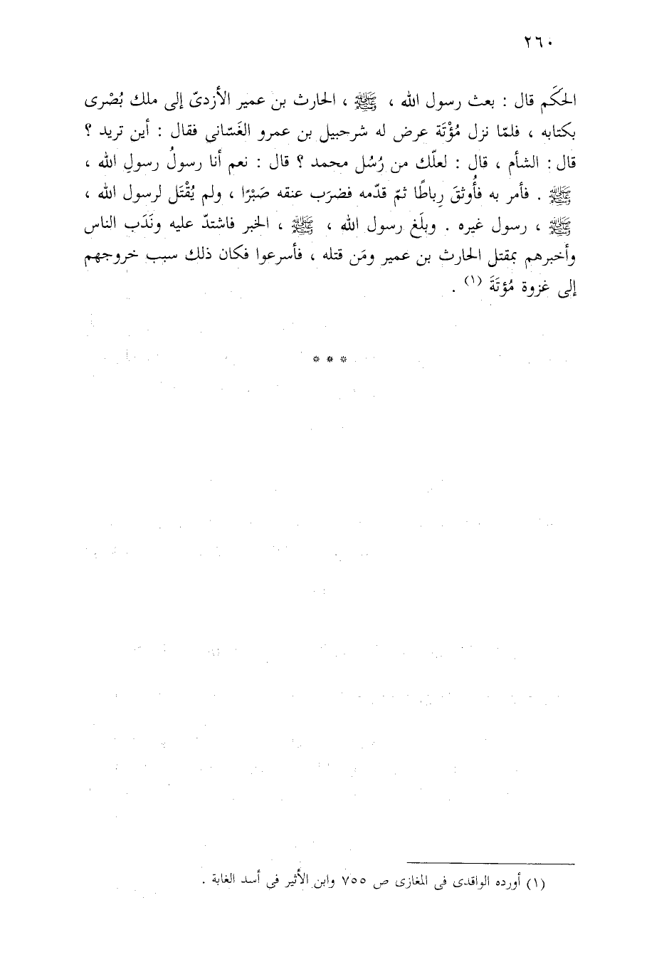 الحكم قال: بعث رسول الله، - صلى الله عليه وسلم -، الحارث بن عمير الأزديّ إلى ملك بُصْرى بكتابه، فلمّا نزل مُؤْتة عرض له شرحبيل بن عمرو الغَسّانى فقال: أين تريد؟ قال: الشأم، قال: لعلّك من رُسُل محمّد؟ قال: نعم أنا رسولُ رسولِ الله، - صلى الله عليه وسلم -. فأمر به فأُوثقَ رِباطًا ثمّ قدّمه فضرَب عنقه صَبْرًا، ولم يقْتَل لرسول الله، - صلى الله عليه وسلم -، رسول غيره. وبلَغ رسول الله، - صلى الله عليه وسلم -، الخبر فاشتدّ عليه ونَدَب النَّاس وأخبرهم بمقتل الحارث بن عمير ومَن قتله، فأسرعوا فكان ذلك سبب خروجهم إلى غزوة مُؤتَةَ (¬١).