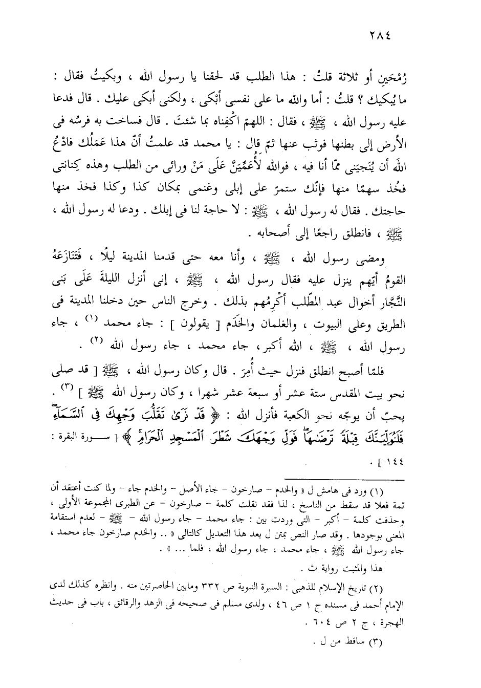 فلمّا أصبح انطلق فنزل حيث أُمِرَ. قال وكان رسول الله، - صلى الله عليه وسلم -[قد صلى نحو بيت المقدس ستة عشر أو سبعة عشر شهرًا، وكَان رسول الله - صلى الله عليه وسلم -] (¬٣).
