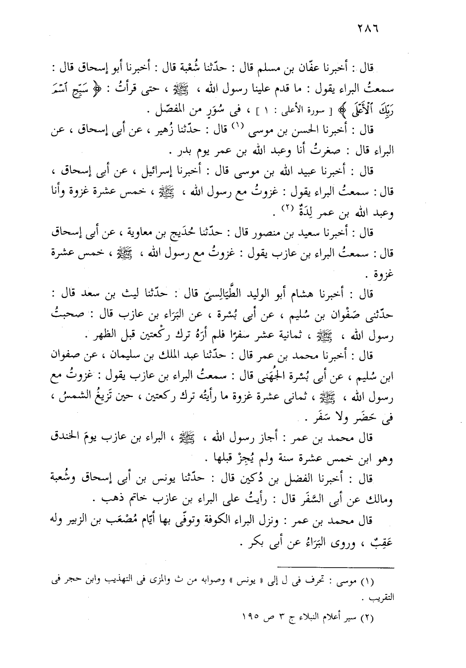 قال: أخبرنا عفّان بن مسلم قال: حدّثنا شعْبة قال: أخبرنا أبو إسحاق قال: سمعتُ البراء يقول: ما قدم علينا رسول الله، - صلى الله عليه وسلم -، حتَّى قرأتُ: {سَبِّحِ اسْمَ رَبِّكَ الْأَعْلَى} [سورة الأعلى: ١]، في سُوَرٍ من المفصّل.