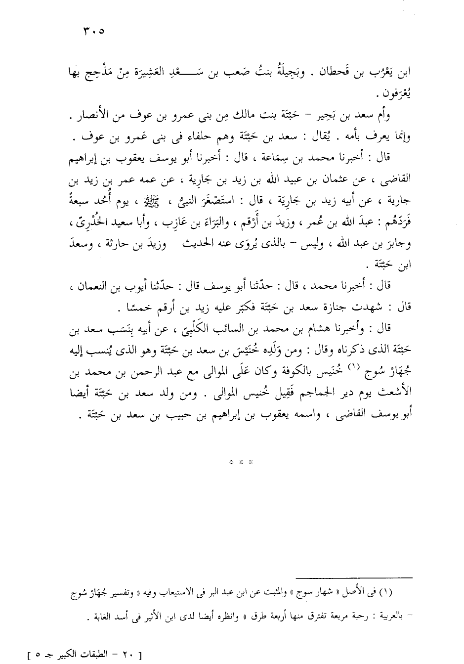 قال: وأخبرنا هشام بن محمّد بن السائب الكَلْبِيّ، عن أبيه بِنَسَب سعد بن حَبْتَة الذي ذكرناه وقال: ومن وَلَدِه خُنَيْسَ بن سعد بن حَبْتَة وهو الذي يُنسب إليه جُهَارْ سُوج (¬١) خُنَيس بالكوفة وكان عَلَى الموالى مع عبد الرحمن بن محمّد بن الأشعث يوم دير الجماجم فَقِيل خُنيس الموالى. ومن ولد سعد بن حَبْتَة أيضًا أبو يوسف القاضي، واسمه يعقوب بن إبراهيم بن حبيب بن سعد بن حَبْتَة.