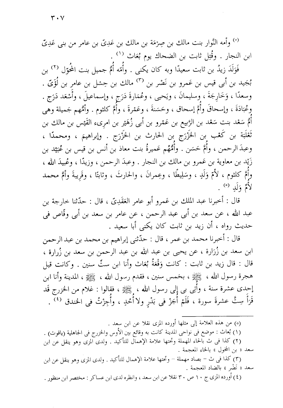 فَوَلَدَ زيدُ بن ثابت سعيدًا وبه كان يُكنى. وأُمّه أُمُّ جميل بنت المُحوّل (¬٢) بن بُجَيد بن أبي قيس بن عَمرو بن نَصْر بن (¬٣) مالك بن حِشل بن عامر بن لُؤَيّ. وسعدًا، وَخَارِجَةَ، وسليمانَ، ويَحيَى، وعُمَارةَ دَرَج، وإسماعيلَ، وأَسْعَد دَرَج. وعُبَادَةَ، وإسحاقَ وأُمَّ إسحاق، وحَسَنةَ، وعَمْرةَ، وأمَّ كلثوم. وأمُّهم جَميلة وهي أُمُّ سَعْد بنت سَعْد بن الرَّبيع بن عَمْرو بن أبي زُهَيْر بن امرِئ القَيْس بن مالك بن ثَعْلَبَة بن كَعْب بن الخَزْرَج بن الحارث بن الخَزْرَج. وإبراهيمَ، ومحمدًا، وعبدَ الرحمن، وأُمَّ حَسَن. وأُمُّهُم عَميرةُ بنت مُعاذ بن أنس بن قيس بن عُبَيْد بن زَيْد بن معاوية بن عَمرو بن مالك بن النّجار. وعبدَ الرحمن، وزيدًا، وعُبيدَ الله، وأُمَّ كلثوم، لأمّ وَلَدٍ، وسَلِيطًا، وعِمرانَ، والحارثَ، وثابتًا، وقَرِيبةَ وأمَّ محمّد للأُمِّ وَلَدٍ (*).