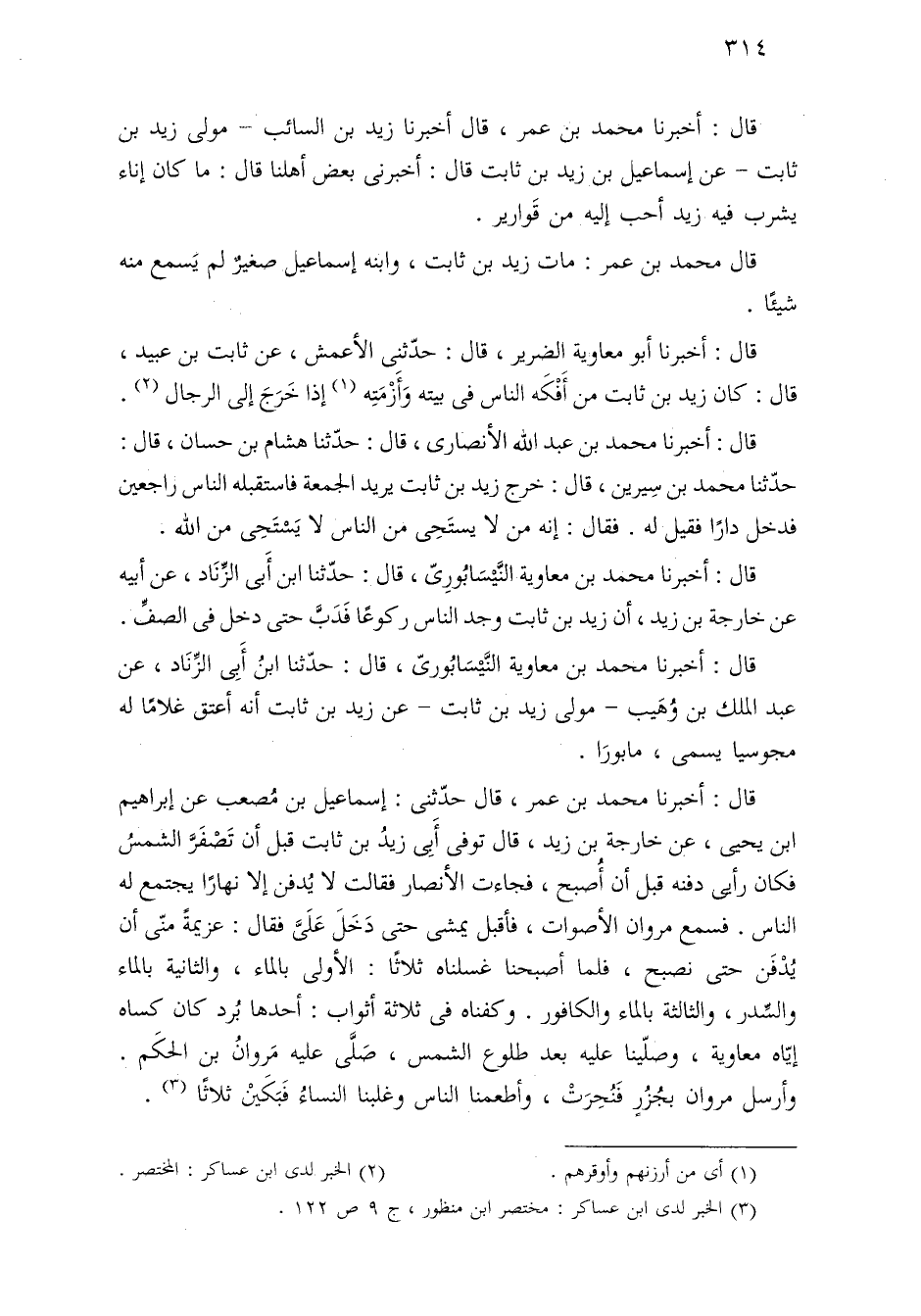 قال: أخبرنا محمّد بن معاوية النَّيْسَابُوريّ، قال: حدّثنا ابنُ أَبِى الزِّنَاد، عن عبد الملك بن وُهَيب - مولى زيد بن ثابت - عن زيد بن ثابت أنه أعتق غلامًا له مجوسيًا يسمى، مابورَا.